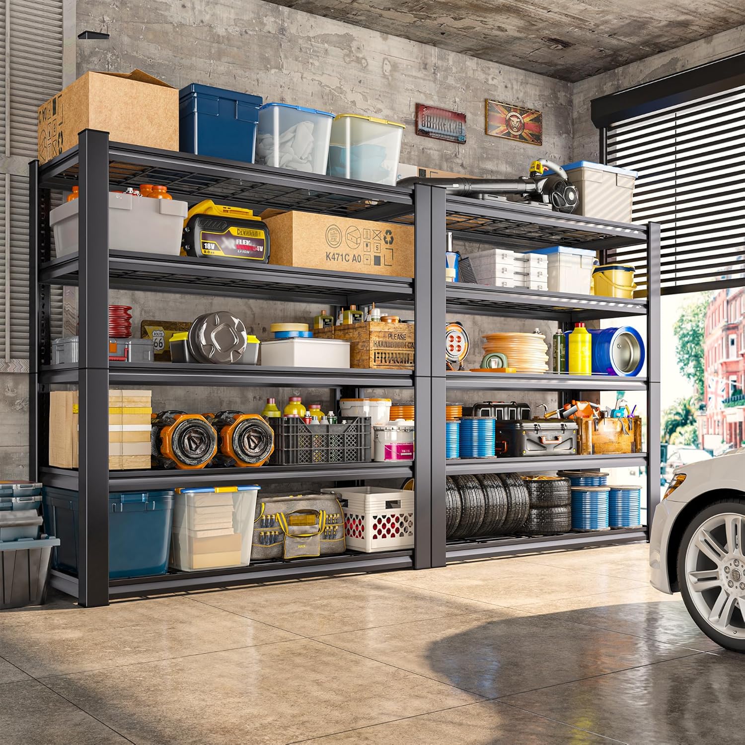 - 【3010LBS Extremely Sturdy】This garage shelving heavy duty has thickened legs. Every solid thickened metal shelf with extra stiffener can hold up to 602 lbs, a total of 3010 lbs bearing capacity gives you good storage experience. No matter how much weight you put on it, the garage storage shelves heavy duty will not wobble or shake