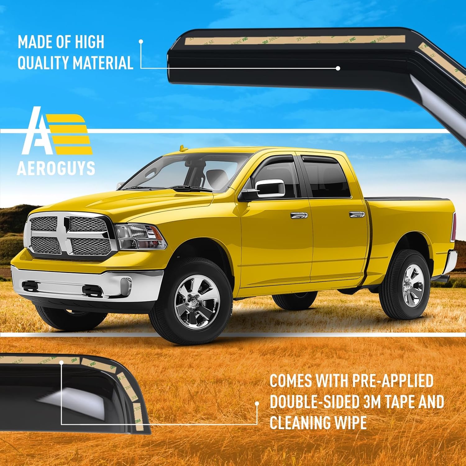 - No Tools Needed, Quick and Easy Assembly β These rain guards are very easy to fit. IN-CHANNEL INSTALLATION provides perfect fit for your truck. Just slip it onto your truckβs window and your job is done within minutes. There is no drilling or no tools required. Be sure that AEROGUYS window deflectors are water resistant, sun protective and will not bend, break or crack regardless of the weather conditions.