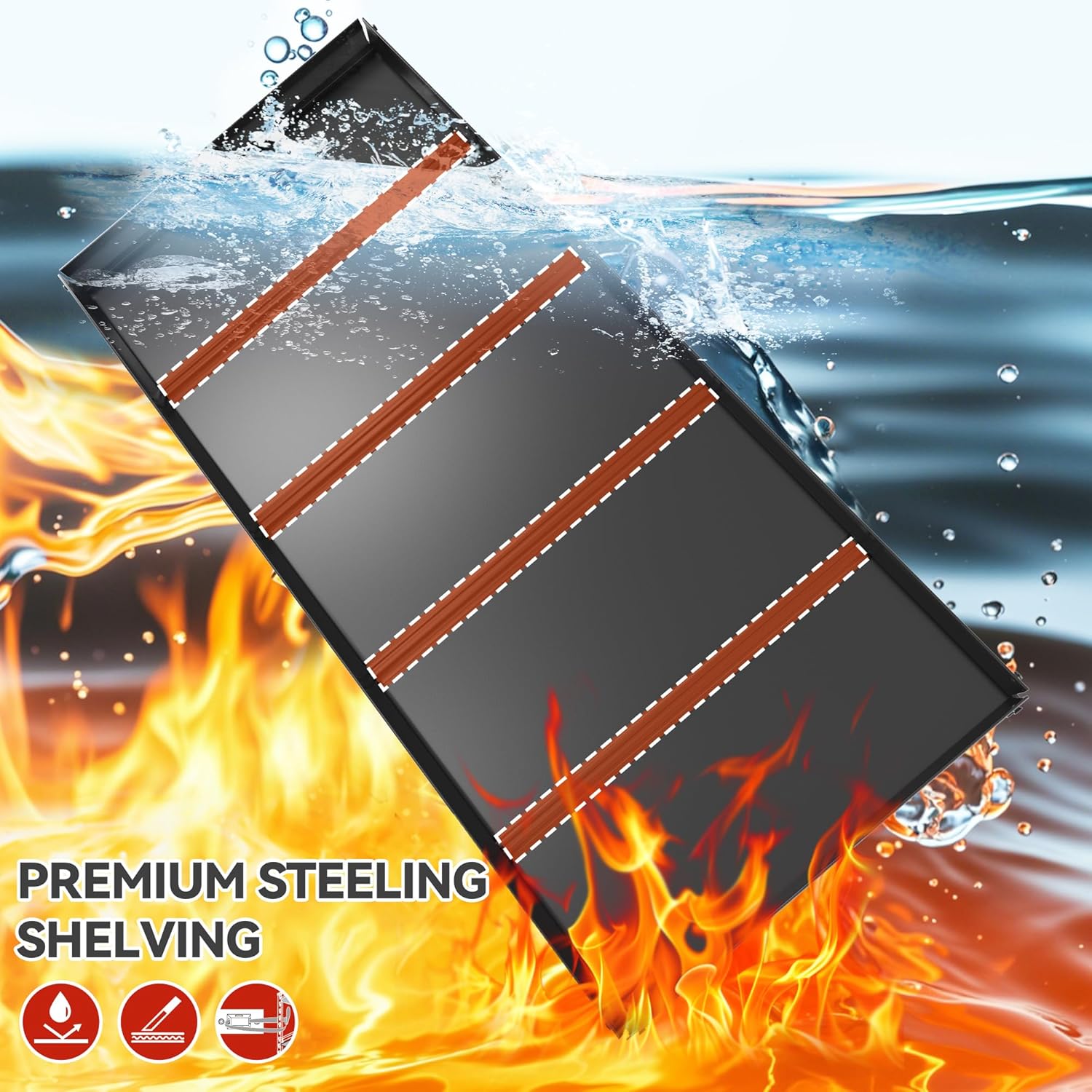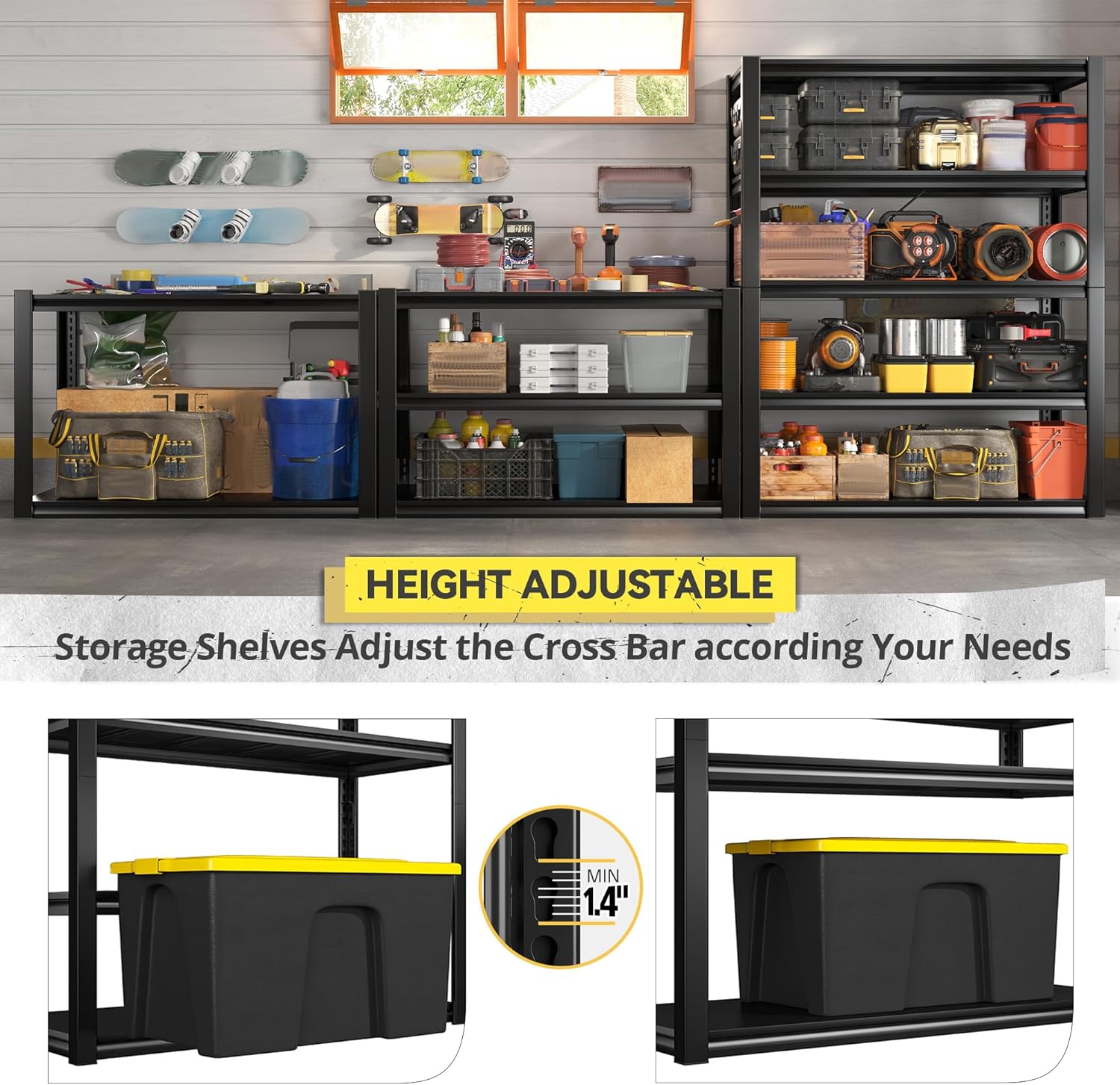 - ăSturdy and Durable Garage ShelvesăNo wobbling or shaking when fully loaded as two-layer vertical support bars will help distribute the pressure. Each metal board has 3 support ribs that ensures no dent or deformation. The storage shelves lasts for decades for all storage needs and meets your expectations