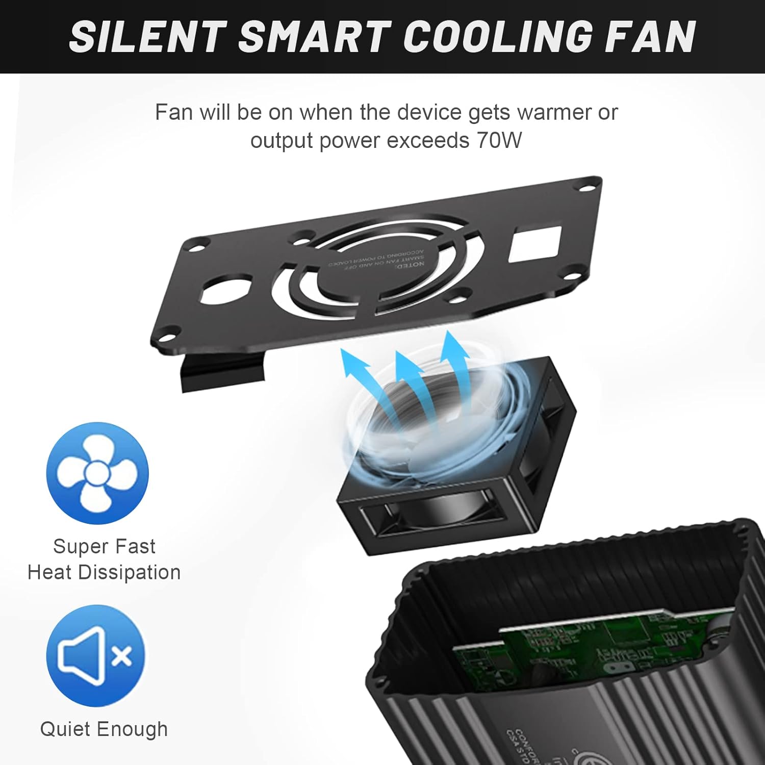 - Durable metal housing provides advanced protection from drops and bumps.Smart cooling fan system makes the car power inverter very silent when operating,and the fan runs faster when the device gets warmer or output power exceeds 70W