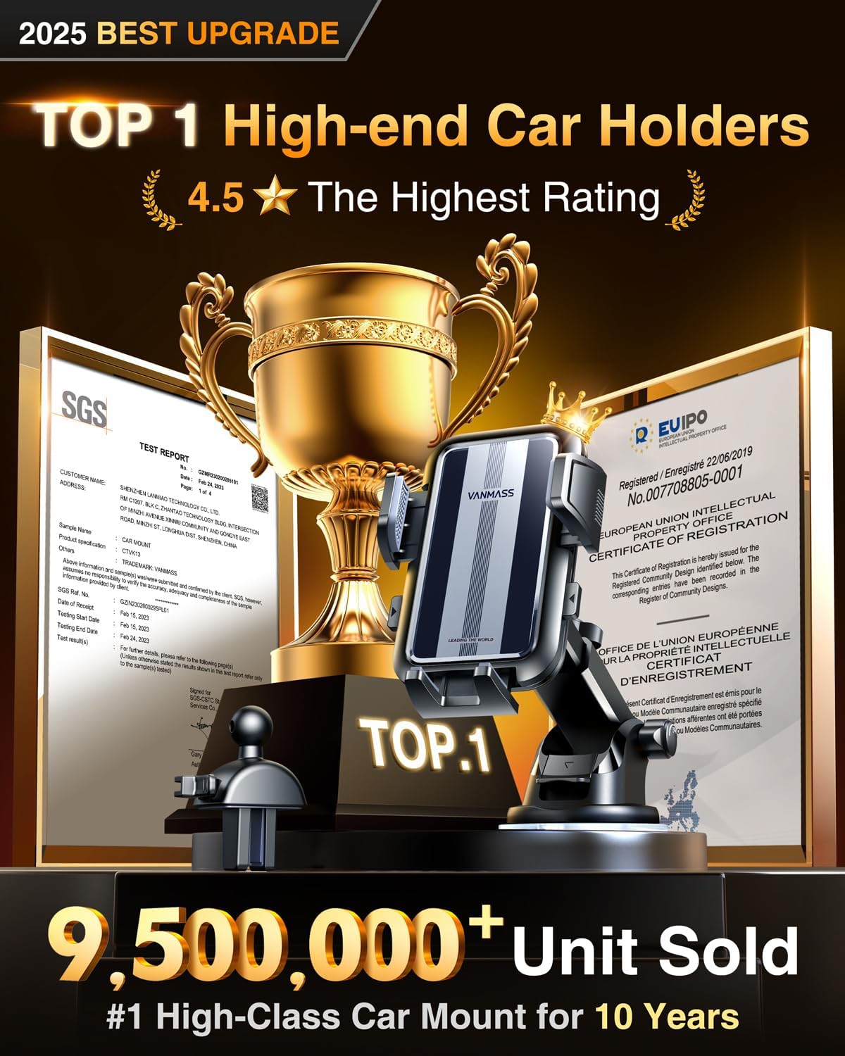 - 【VANMASS Leading the standard】Through 8 years of technical expertise, We use the best designs, and leading materials with world-first-class standards & tests to build this car phone cradle that lives at least 5 years. The Ultra Stable suction cup, anti-live heat & cold material, Upgraded Mirror Panel, and deeper Clamp Arm for Most Compatibility and protection. Make it the most preferred car mount in the class.