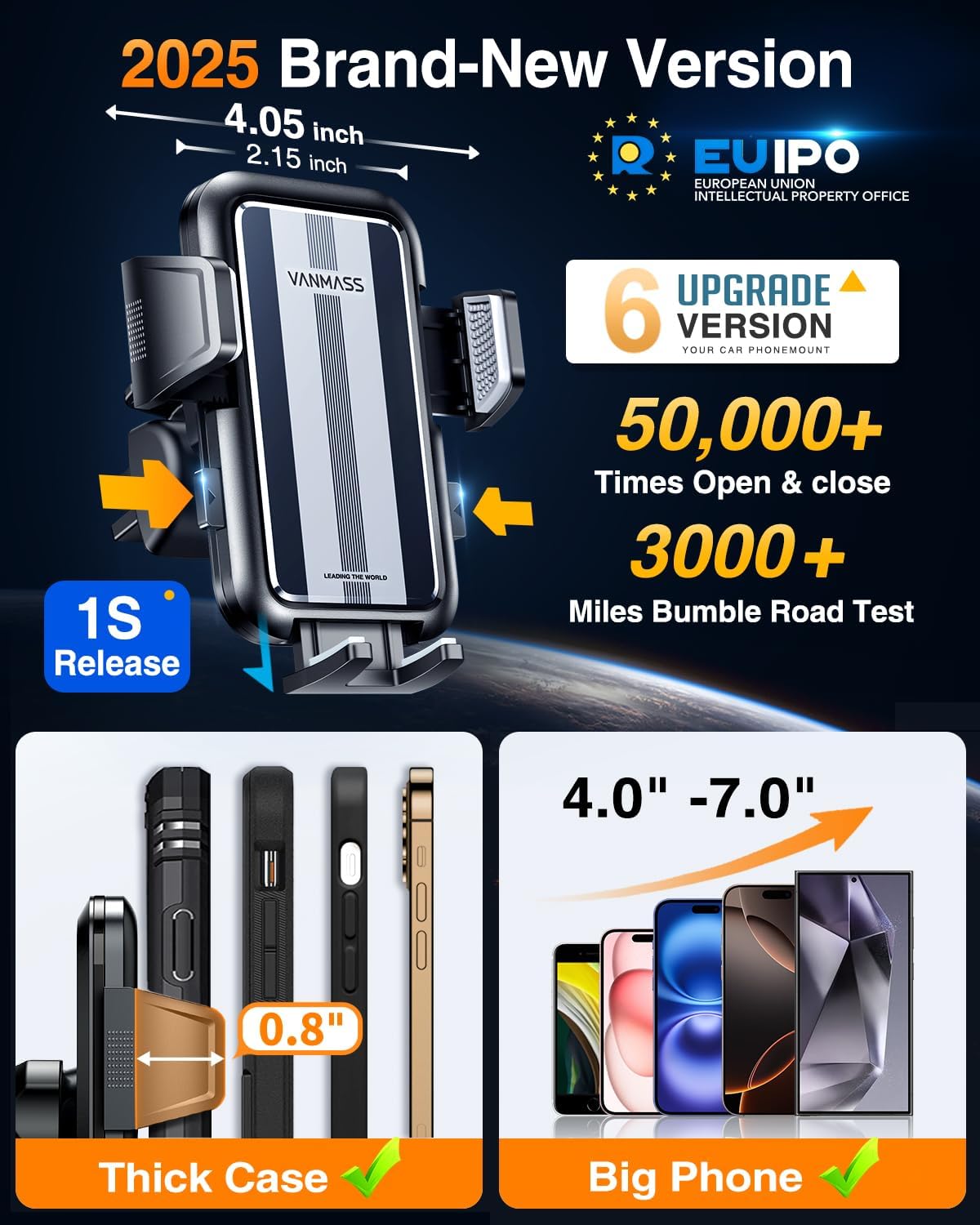 VANMASS 2025 True Upgrade [85+LBS] Phone Holders for Your Car [Strongest Suction & Clip] Cell Phone Mount Dashboard Windshield Vent Stand Cradle for iPhone 16 Pro Max 15 14 13 Android, Silver