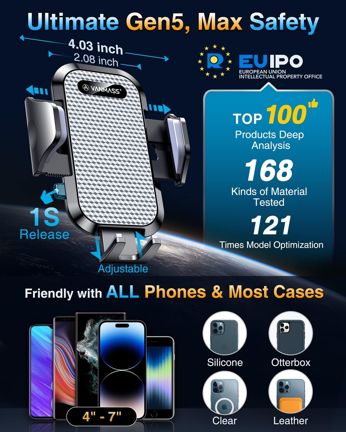 - ăTrue Military-Grade Certified, 2024 Upgraded Ultimate Car MountăVANMASS, the leader in high-end car phone holder. Over the past 8 years, We have listened to the voices of millions of users, rigorously tested to MILITARY GRADE standards (stability, compatibility, flexibility, security, durability). Finally, we overcome all weaknesses to design the Ultimate Model that we are most satisfied with. This item obtained international military-grade shockproof certification No. GZMR220601855501