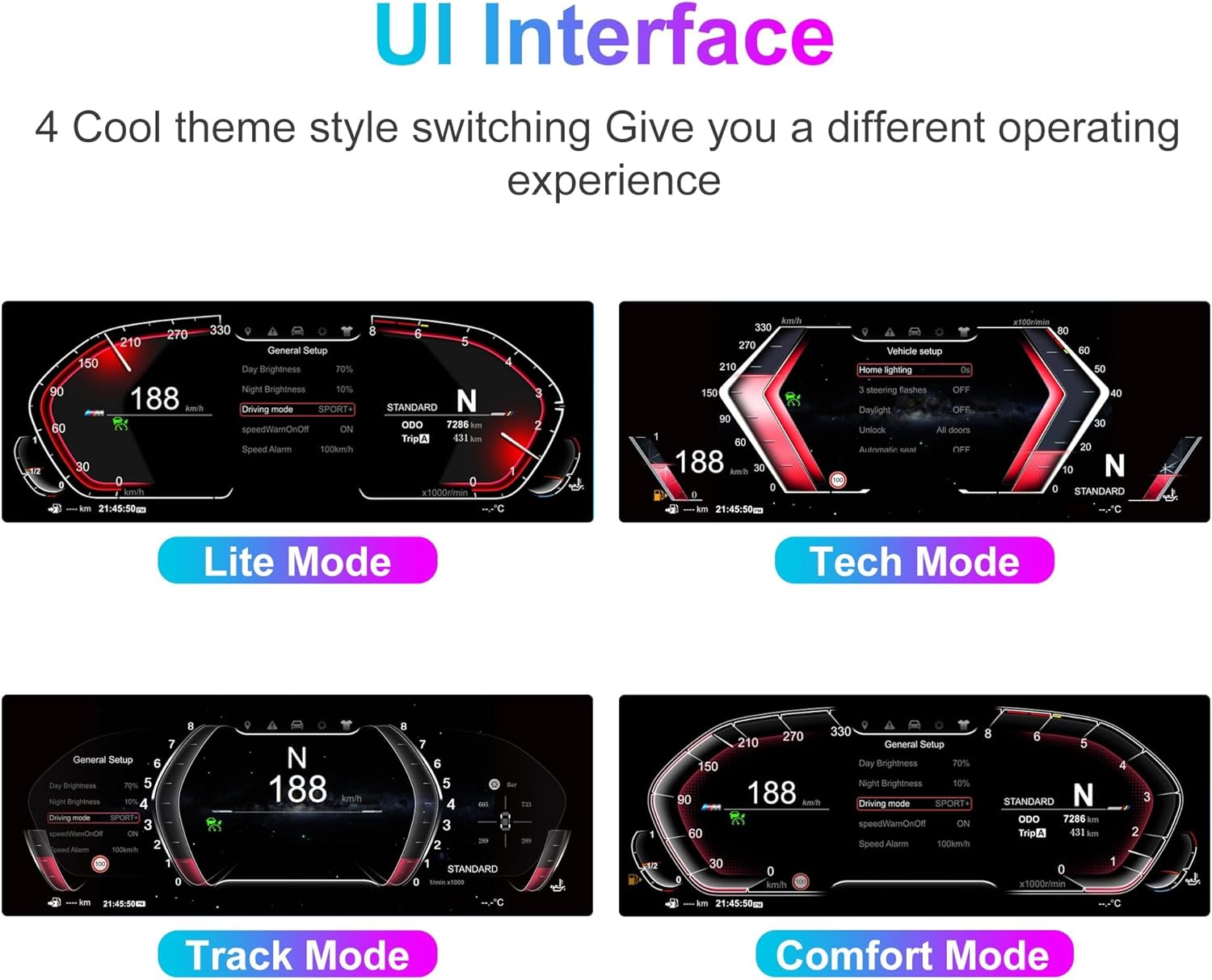 - ✔️[4 sets of UI styles can be freely switched] This digital cluster odometer features 4 customized modes (simple, comfortable, track, and technology) for the LCD. Additionally, it offers 4 color interfaces (red, purple, blue, and orange) that can be freely changed to enhance your driving comfort. The original vehicle data and information are presented more intuitively