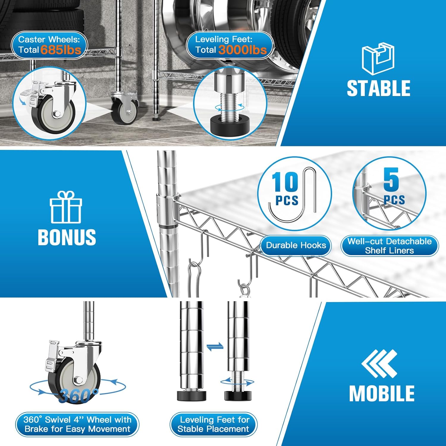 Wire Shelving with Wheels, 48x18x72 Inch, 3000 Lbs Storage Shelves Heavy Duty, Commercial-Grade Adjustable Utility Shelf, NSF-Certified Metal Storage Rack with Shelf Liners, 5-Tier, Chrome