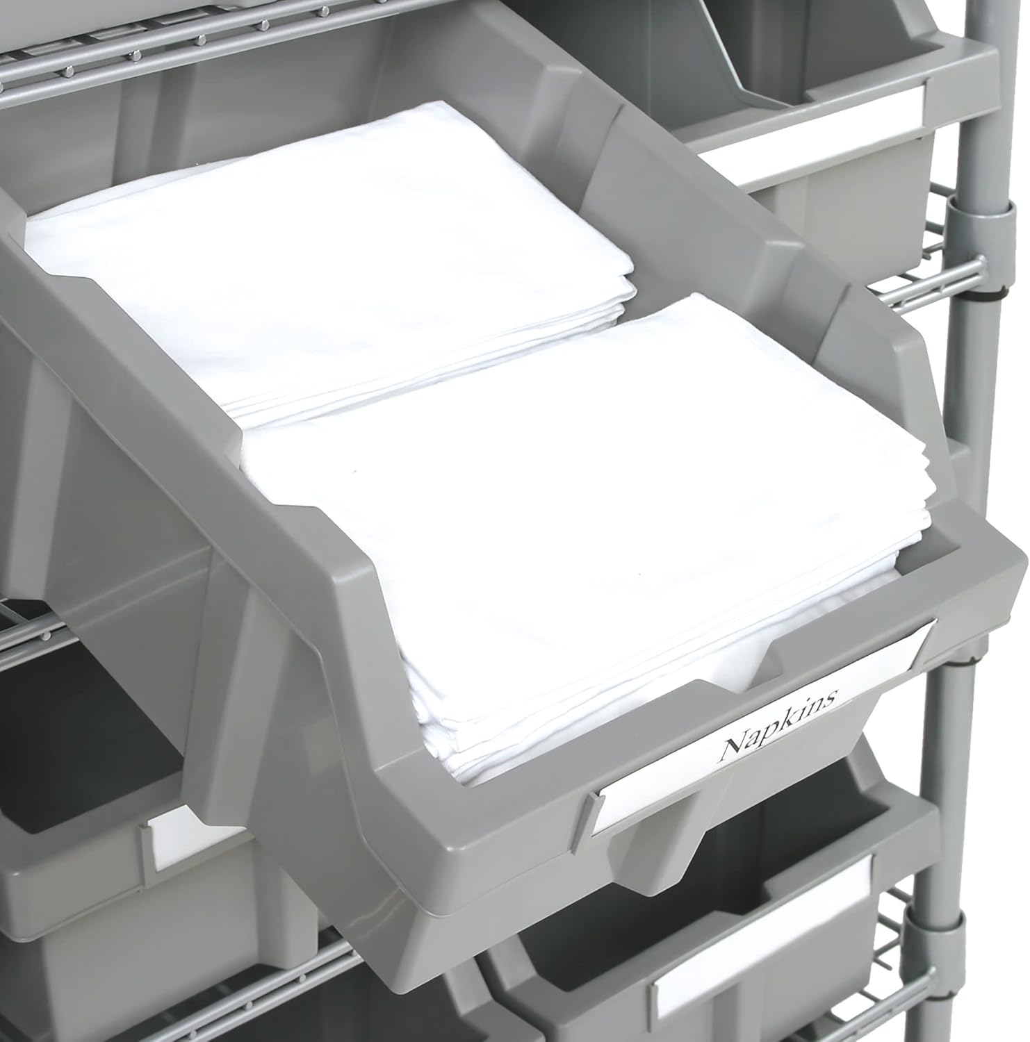 - 12 BINS — 12 removeable high-impact polypropylene (HIPP) gray bins (10.5” W x 14.25” D x 7” H); Plus 2 bin dividers and 12 bin labels.
