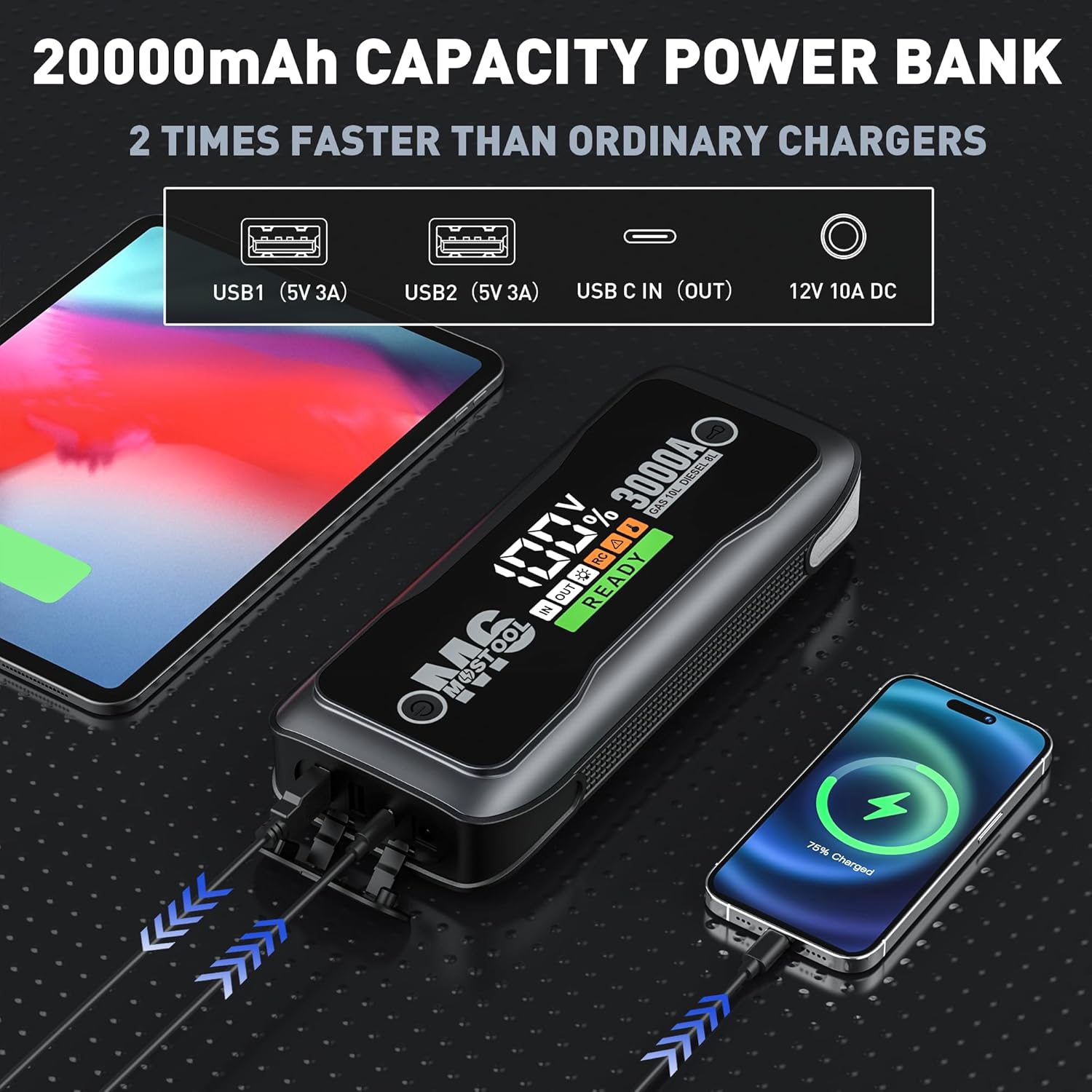 - đ ăPower for More Than Just StartingăWith a 20,000mAh battery, the MOSTOOL M6 jump starter power pack also serves as a power bank. Dual USB outputs and a 30W PD port provide fast charging for smartphones, tablets, and more. Its 12V-16.8V/10A DC output supports air compressors, inverters, and vehicle accessories. Portable jumper starter functionality goes far beyond emergencies