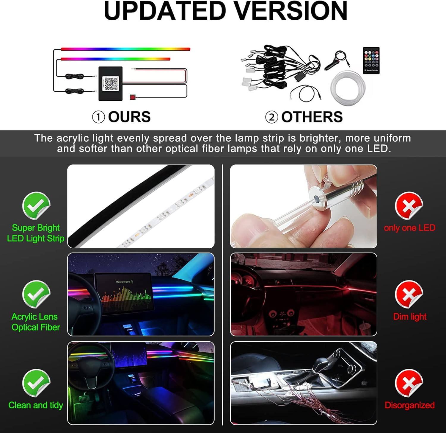 - ăHigh Bright & UniformăThe RGB Acrylic Light Strip have super bright LED and acrylic lens and contains 2 acrylic fiber optic light strips (1*14.17 inches + 1*43.3 inches) and one master controller, which is plug and play, and the light is more uniform and softer than other fiber optic lights that only rely on one light source.