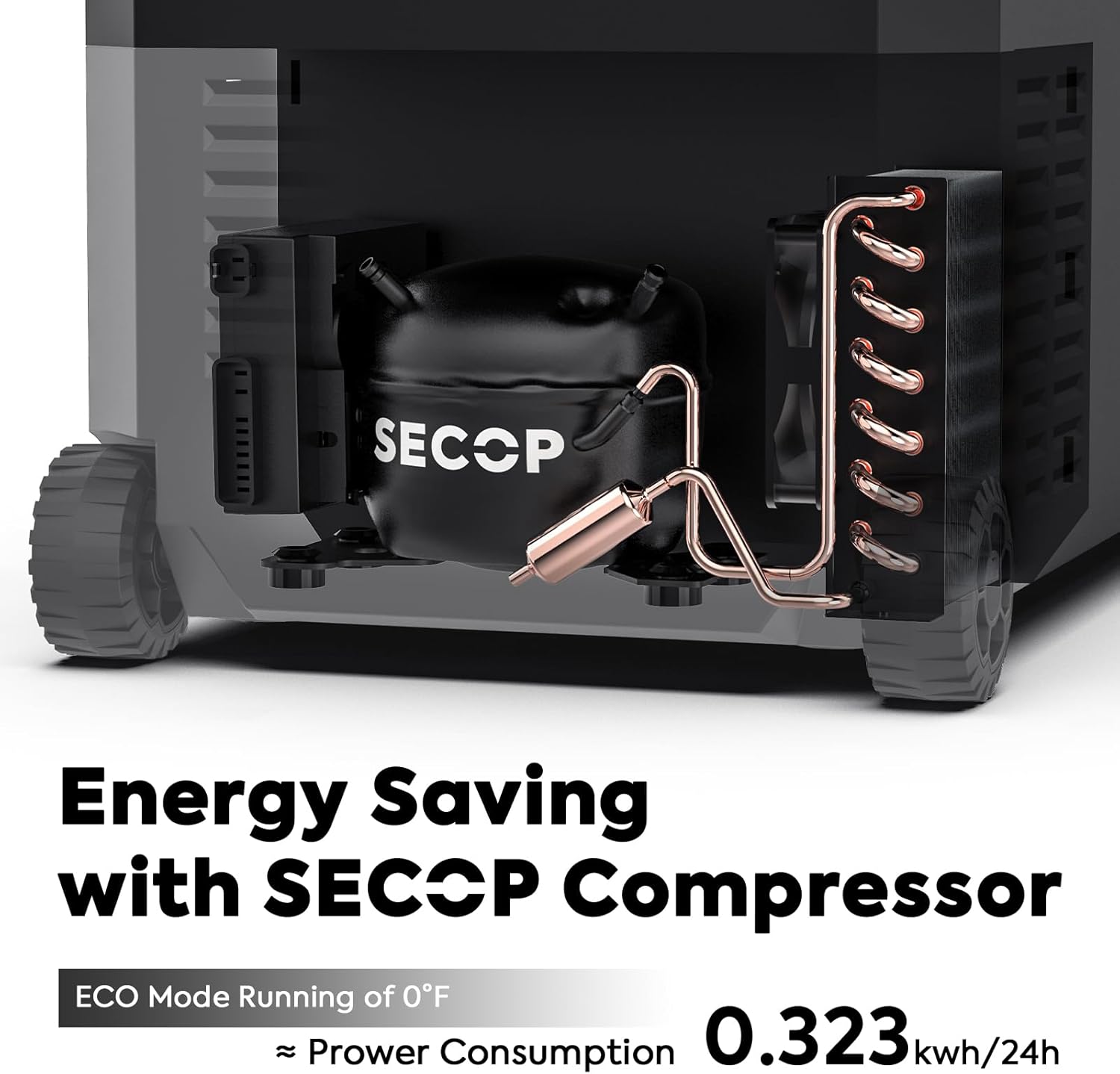 - Upgraded - Cooling range from -4°F to 68°F to meet all your freezing or refrigeration needs. SECOP Compressor makes the car refrigerator keep running well even under 40° tilt.As an upgrade, we have redesigned the exterior of the refrigerator while using higher-quality materials. The simplicity of the exterior is complemented by the high quality of the housing materials.