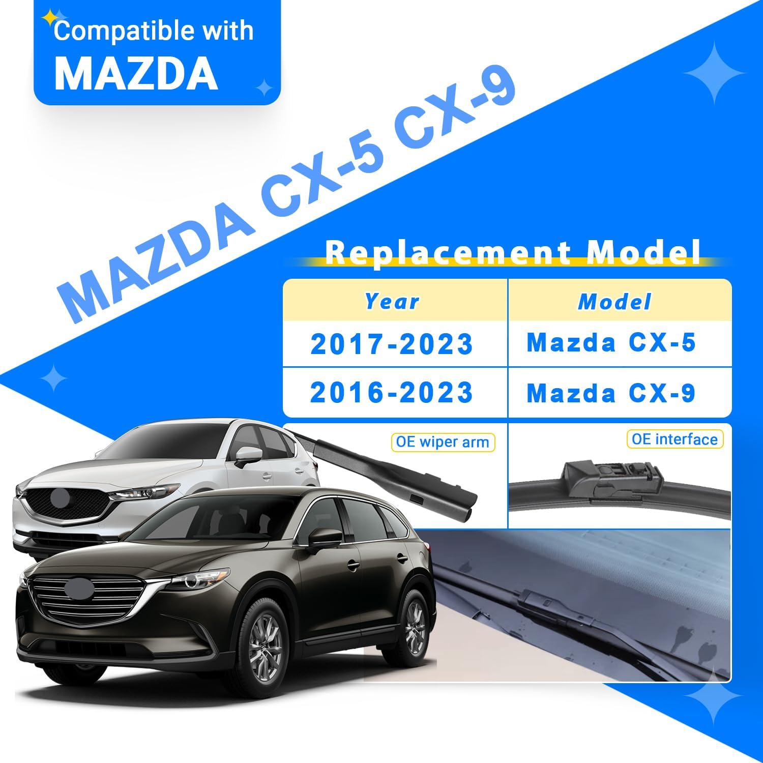 - {FITMENT1}: Replacement for 17 18 19 20 21 22 23 Mazda CX-5 24inch + 18inch front with 14inch rear windshield wiper blades.