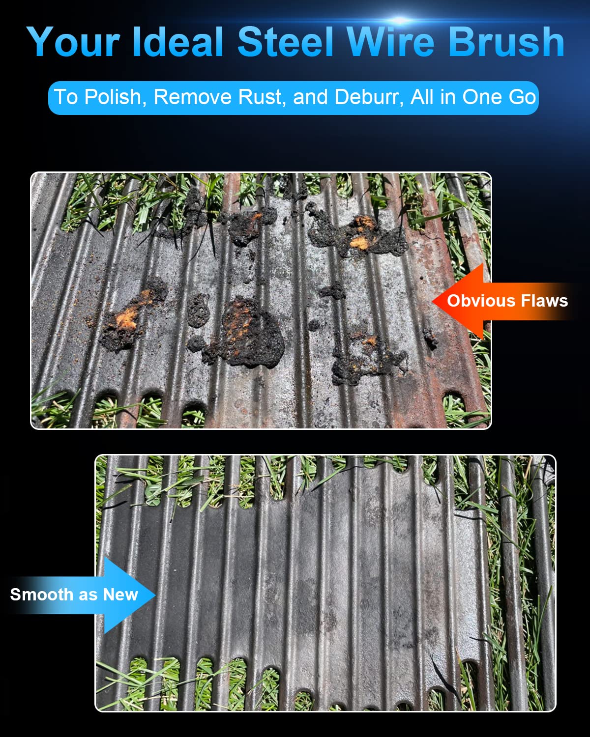 - Wide Applications: Easily and smoothly remove heavy corrosion, rust, paint, spatter and scale removal while also clean weld edges, debur metal and paint.