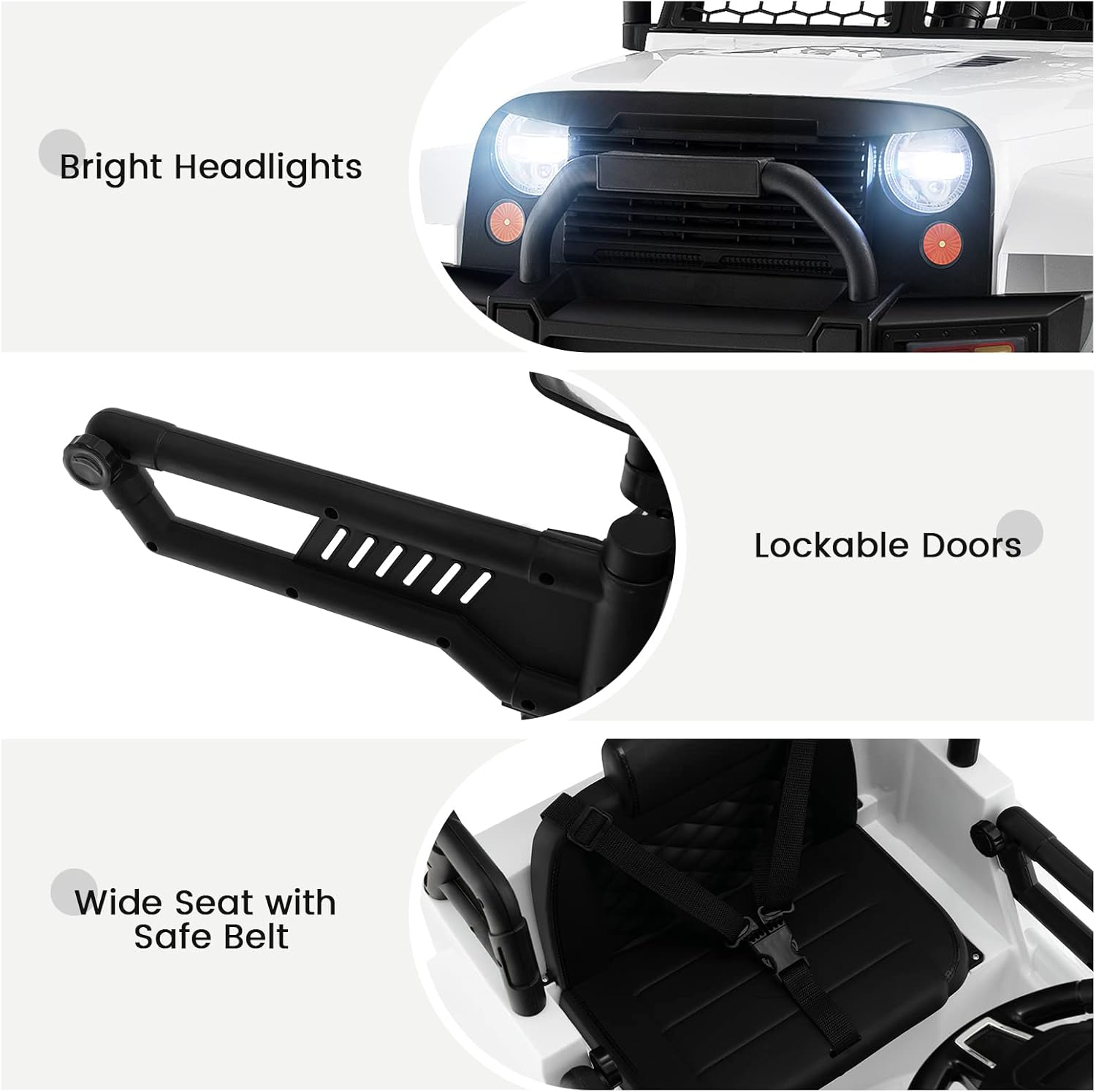 - Safety as First Priority: The kids car is equipped with the soft start function and rear wheels spring suspension to protect your children. Adjustable seat belts and safety door locks also keep the kids safe. Max Weight Capacity: 66 Ibs