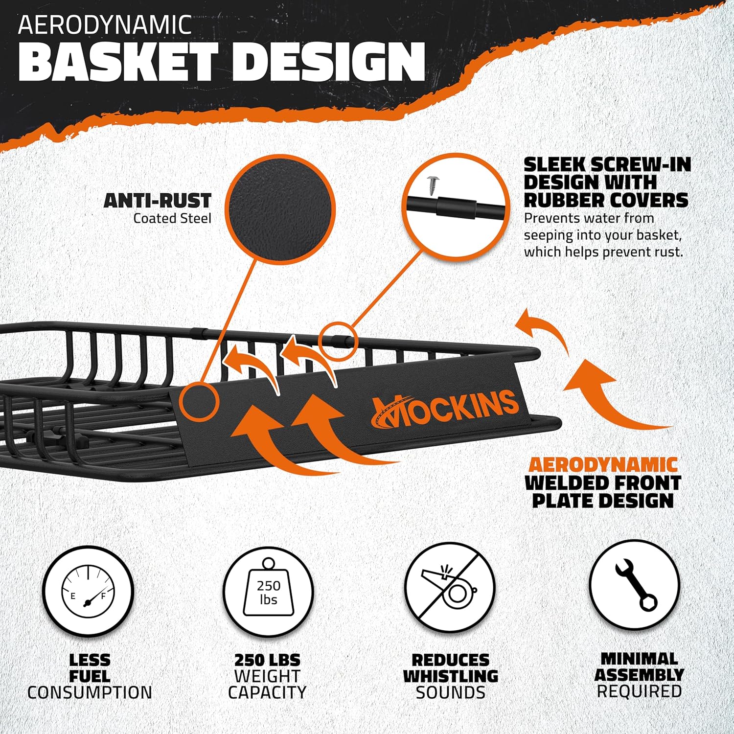 - Weather-Ready Rooftop Cargo Carrier : Enhance both style & performance with this metallic black car roof cargo carrier . Built to support up to 250 lbs., these roof top cargo carriers easily mount to any crossbar-equipped vehicle. The weatherproof, rust-resistant steel frame of the car top carrier roof rack basket provides durability, while its aerodynamic shape helps reduce wind resistance, noise & fuel inefficiency. Pack smarter & drive safer with the Mockins Luggage Carrier for Car Rooftop .