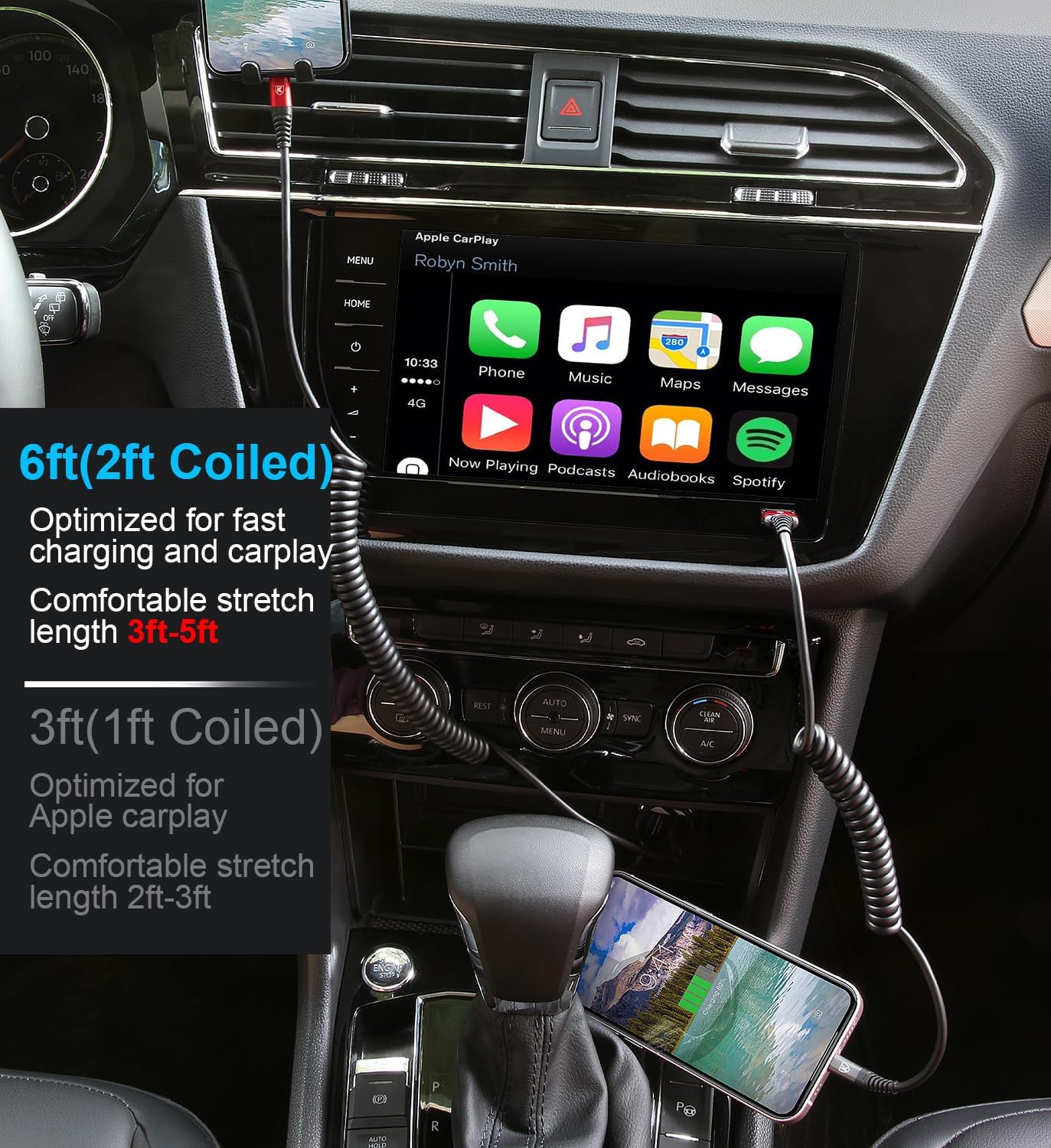 - Elastic Coiled Lightning Cable : Coiled lightning cable 3FT (stretchable to 4.8FT, comfortable stetch length 2ft-3ft) coiled lightning cable 6FT (stretchable to 6.5FT, comfortable stetch length 3ft-5ft) and bounce back to normal length. If you use CarPlay and store your iPhone in a cubicle, we recommend using 3ft; if you use your device lying on the couch while you are charging, you can choose 6ft. iPhone charging cable 3ft and 6ft can meet your different needs.