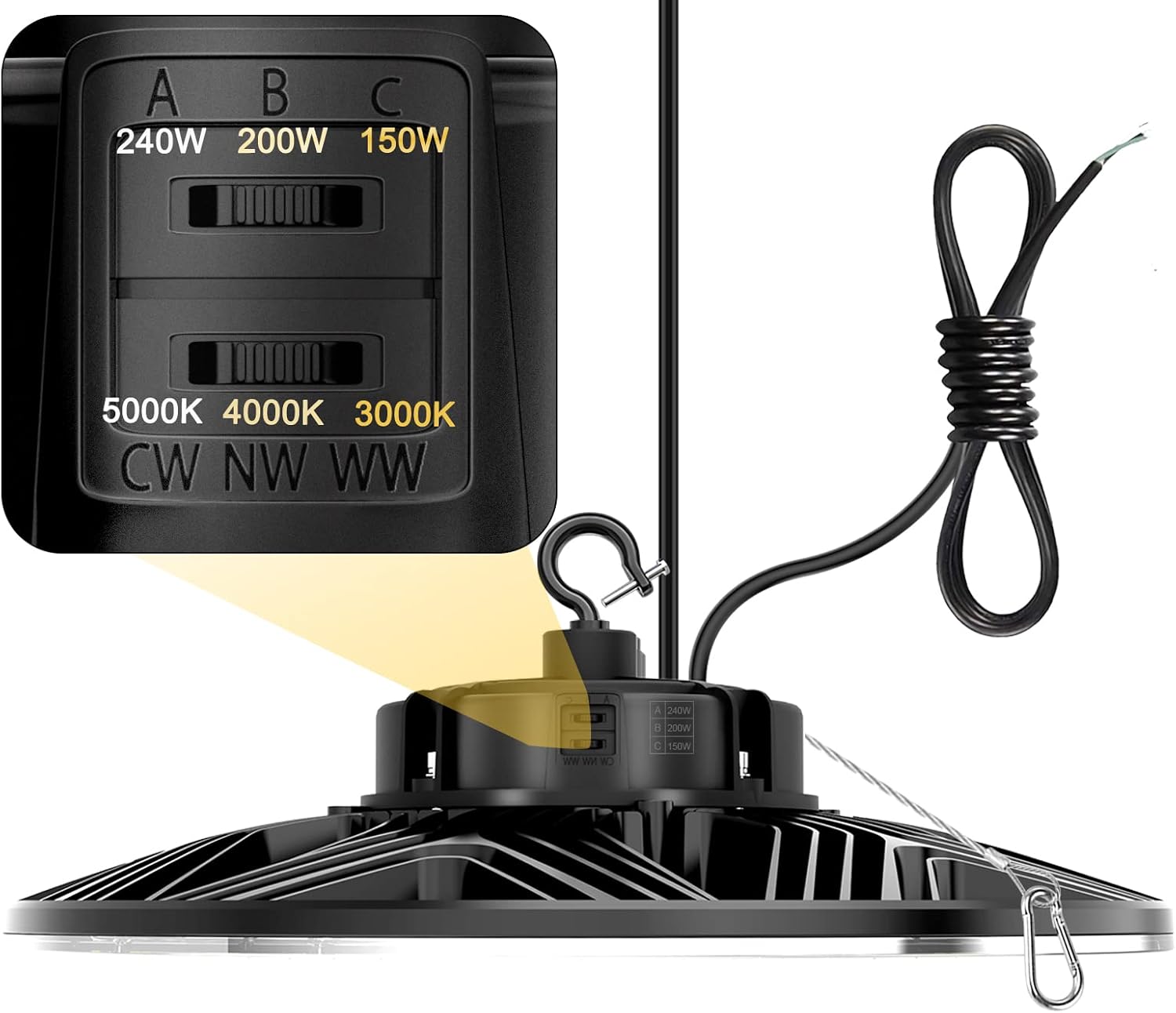 - Adjustable Wattage: This LED high bay light have 150W(21000LM),200W(28000LM), 240W(33600LM),3 wattage selectable. No need to worry about what wattage to buy, Will not too bright or too dark due to fixed ceiling height. More flexible mounting heights from 12 feet to 30 feet