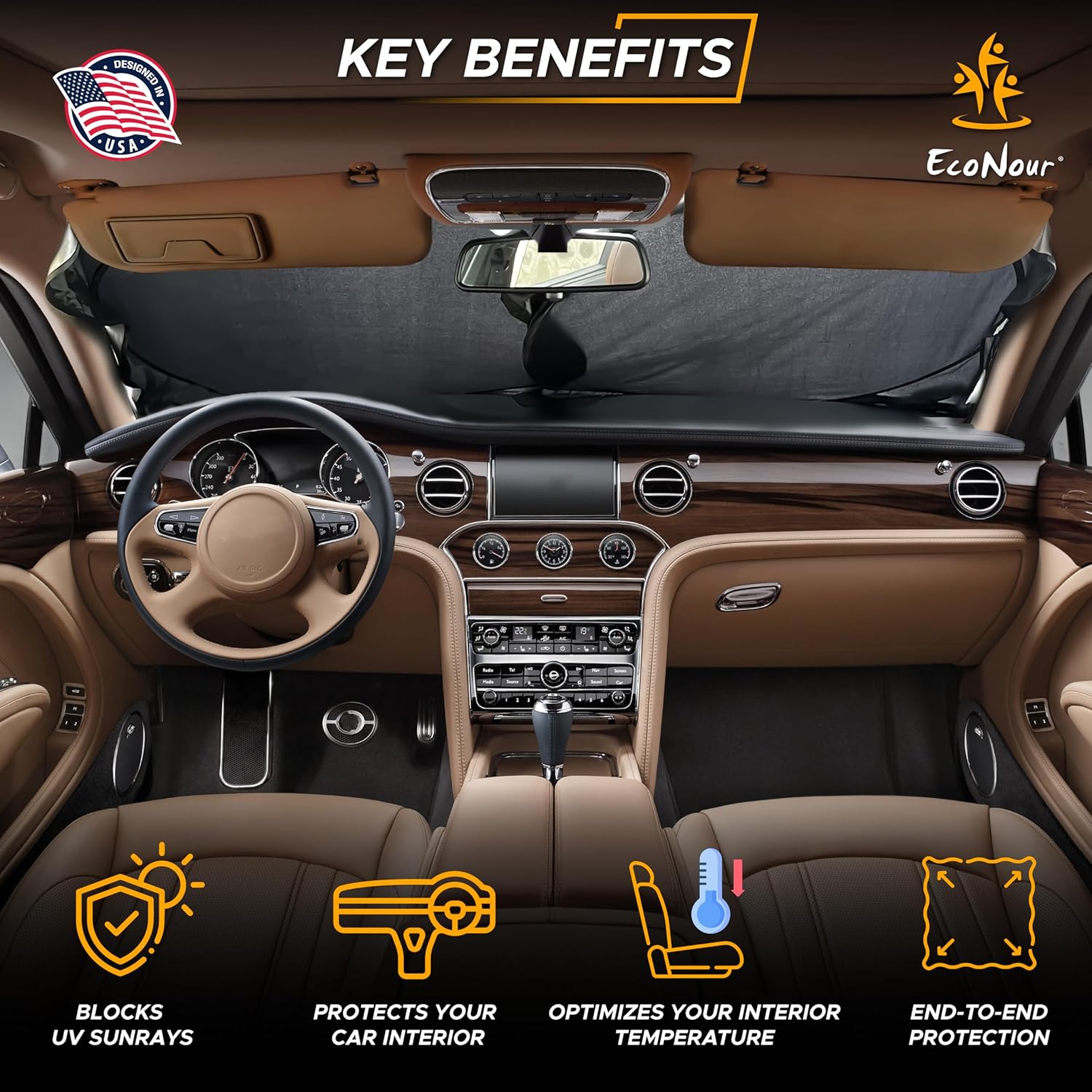 - Superior Sun Protection: EcoNour’s cool window sunshade is crafted from premium 240T polyester, offering outstanding UV protection. This durable automotive heat shield effectively blocks sunlight, keeping your car’s temperature at an optimal level and enhancing passenger comfort.