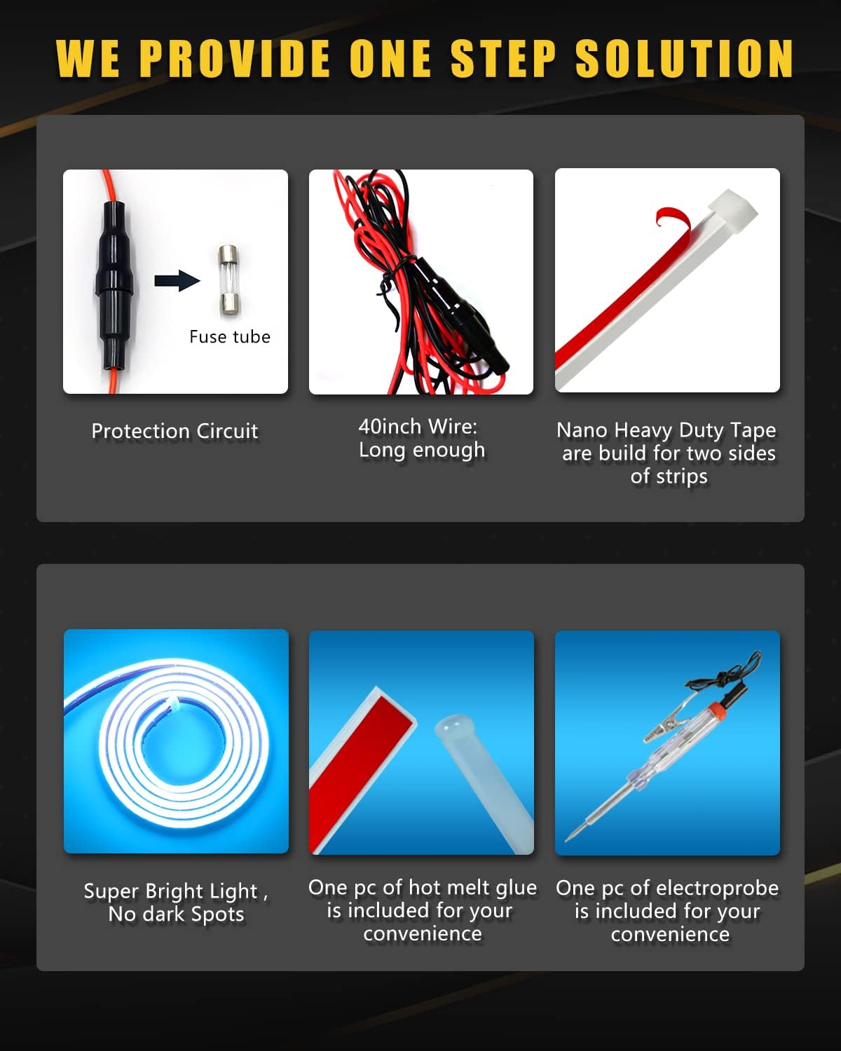 - ăFuse ProtectionăThe Car led strip light is made of soft silicone with heavy duty Nano Tapes on both sides,Super Bright,No dark Spots.Short circuit protection to enhance the safety.