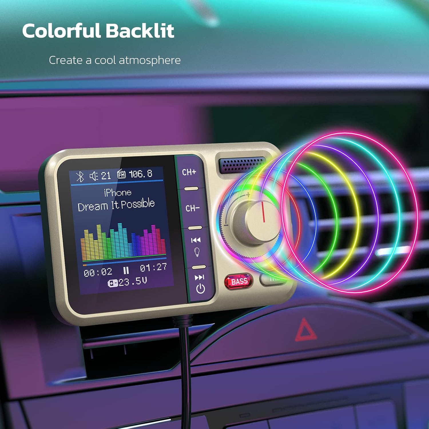 - 8 Colorful LED Backlit Modes: Long press the light button on the fm transmitter bluetooth for car to enter the light change mode, and then spin the knob to adjust to the light mode you want. There are 7 mono color modes plus 1 color-changing mode, choose any mode you like to decorate your space, let it color your car!