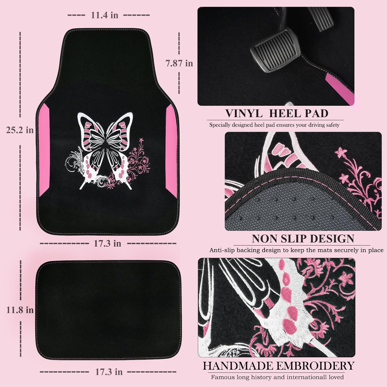 - High Quality Materials:Our pink leather & gaberdine butterfly seat covers can well protect your car interior from stains, spills and daily wear and tear. handmade embroidery butterfly and flower car floor mats with embroidered butterfly steering wheel cover -Shinning pearl of Chinese art. Very beautiful and comfortable. Match your interior look perfectly.
