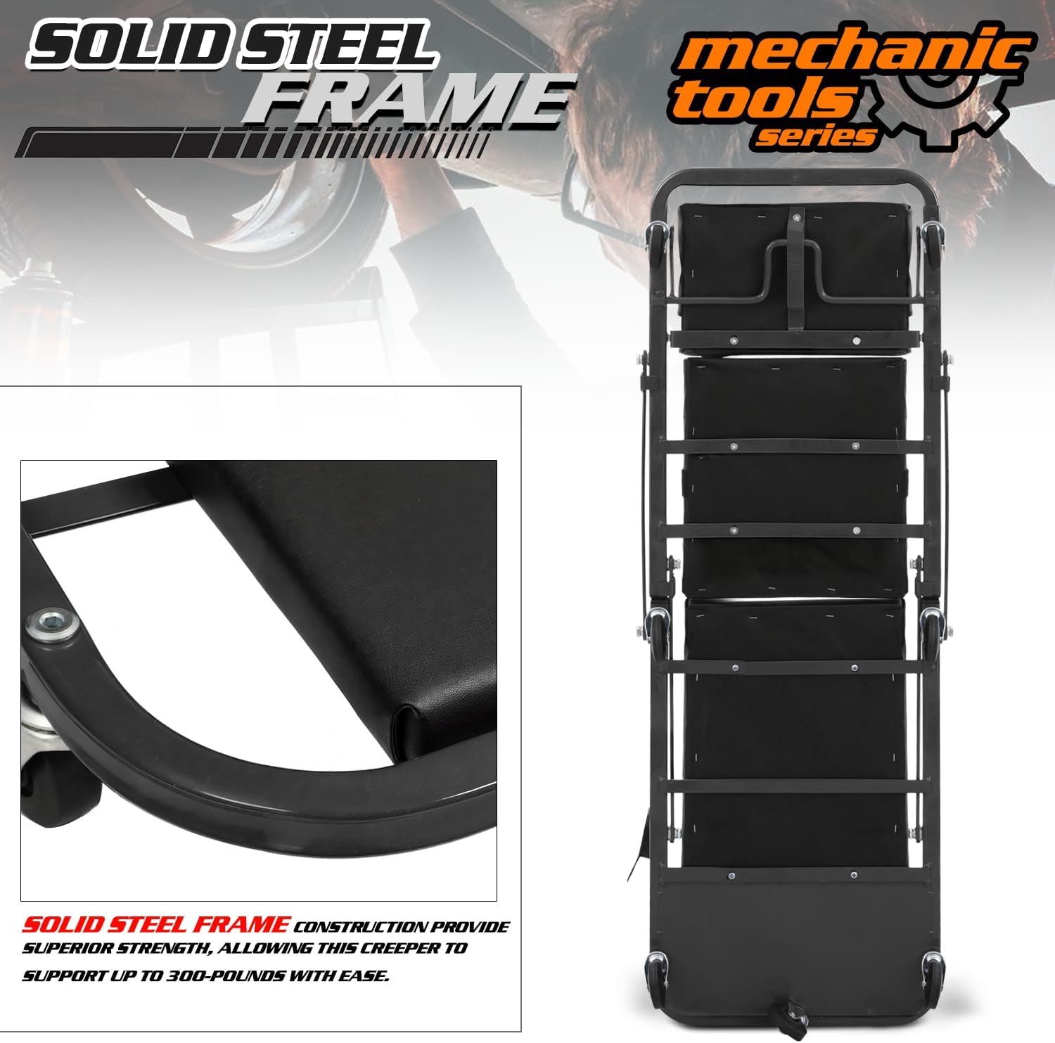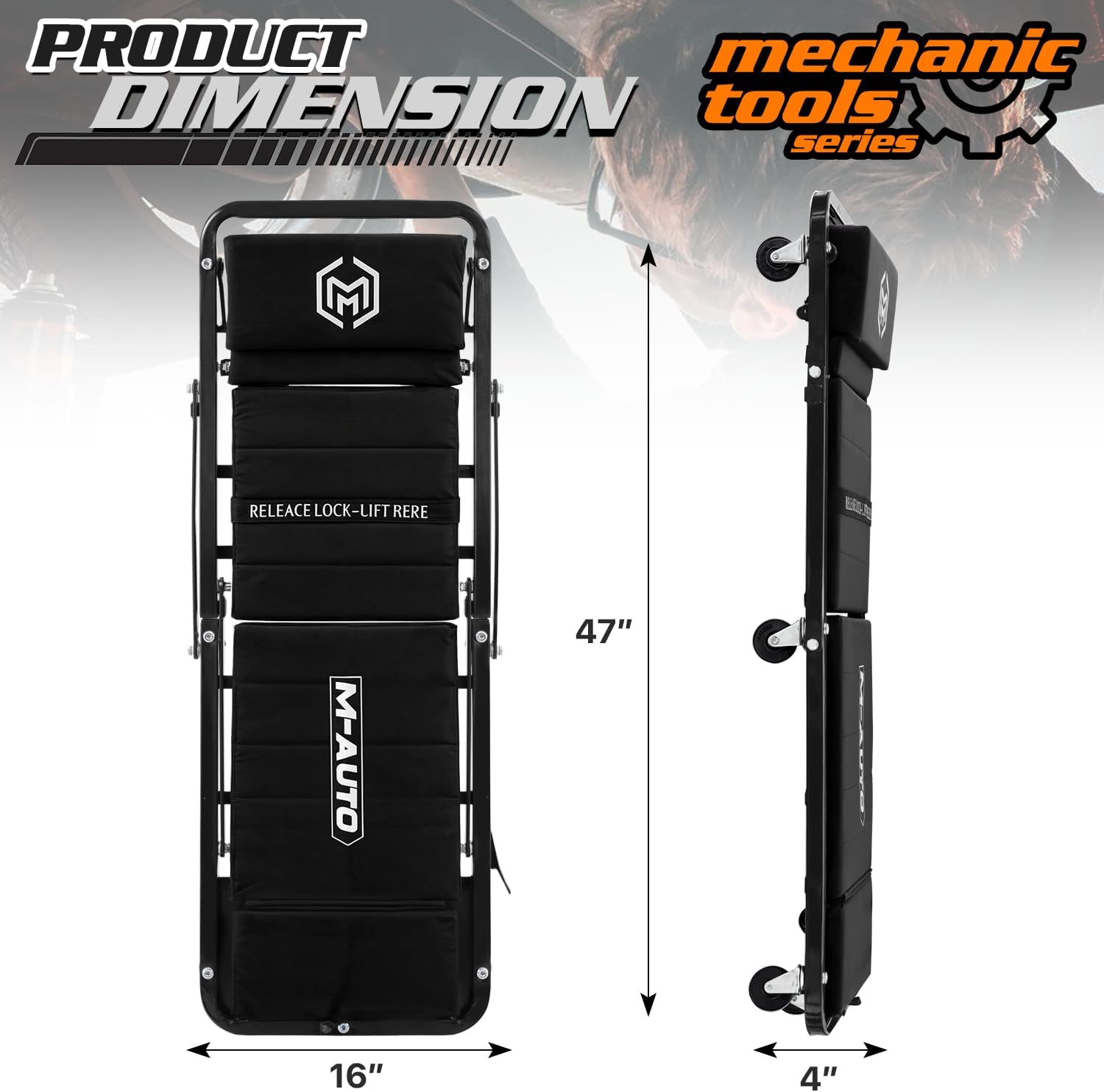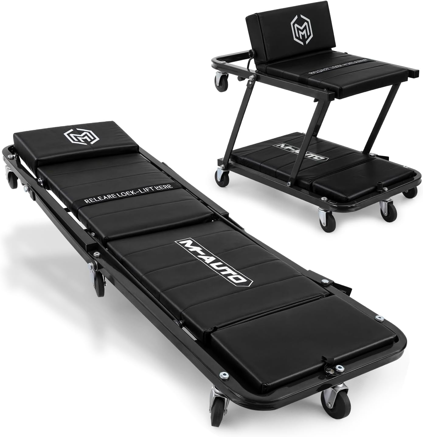 M-AUTO Heavy-Duty Convertible Mechanic Creeper, Z-Creeper 2-in-1 Creeper and Seat 48" Padded Adjustable Headrest Roller Garage Chair with 7 Swivel Casters for Washing, Detailing, Maintenance, Black
