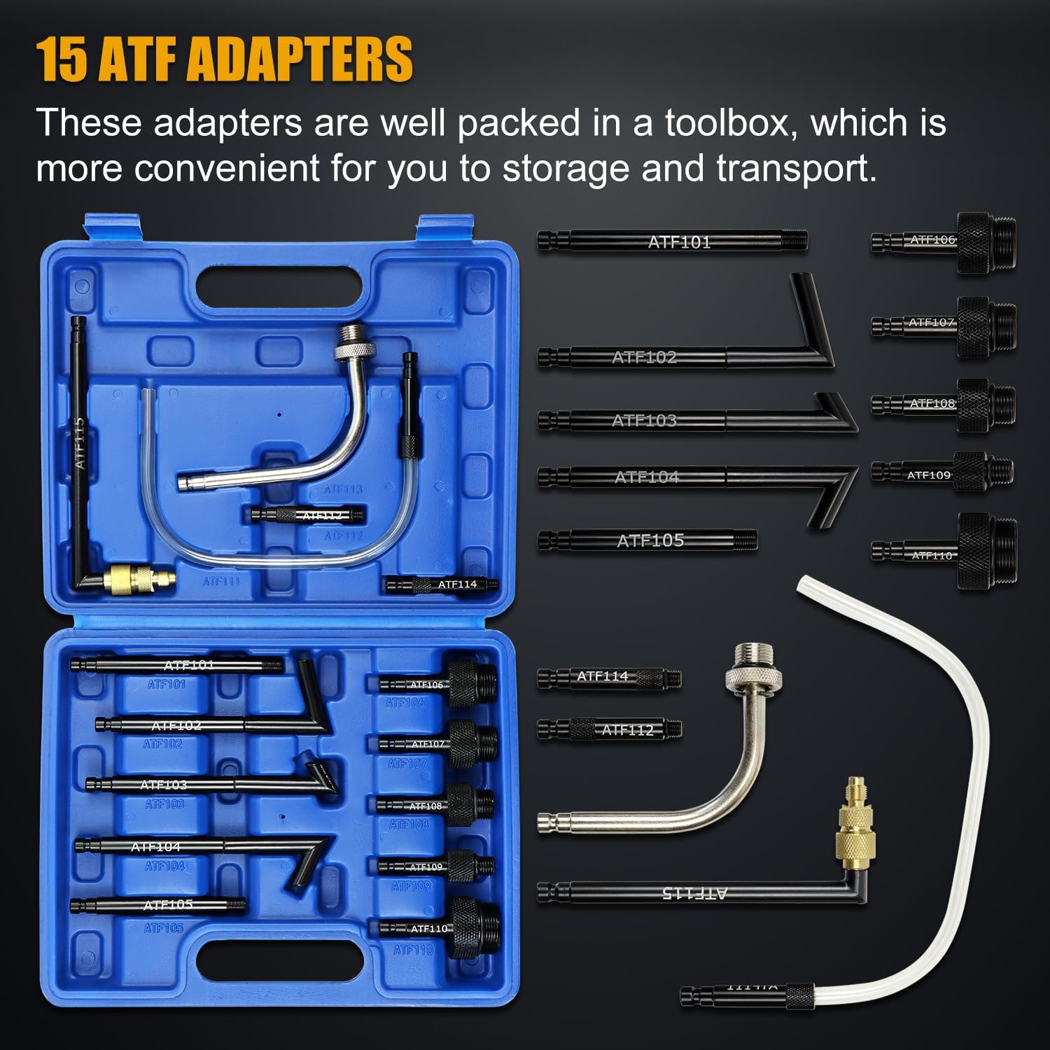 - ATF Adapters: ATF extractor and dispenser tool includes 15 PCS ATF adapters, which are well kept in a blow-molded case. These adapters compatible with Ford, BMW, Nissan, Honda, Audi, Volkswagen DSG, Volkswagen CVT, Skoda, Porsche, Mercedes, Mini Cooper, Kia, Toyota, Hyundai, Infiniti, Volvo and Lexus. Unplug the drain plug at the bottom of the gearbox, drain the used transmission fluid, connect the ATF adapter to the fill or drain port, push the new ATF into the engine by the fluid transfer pump