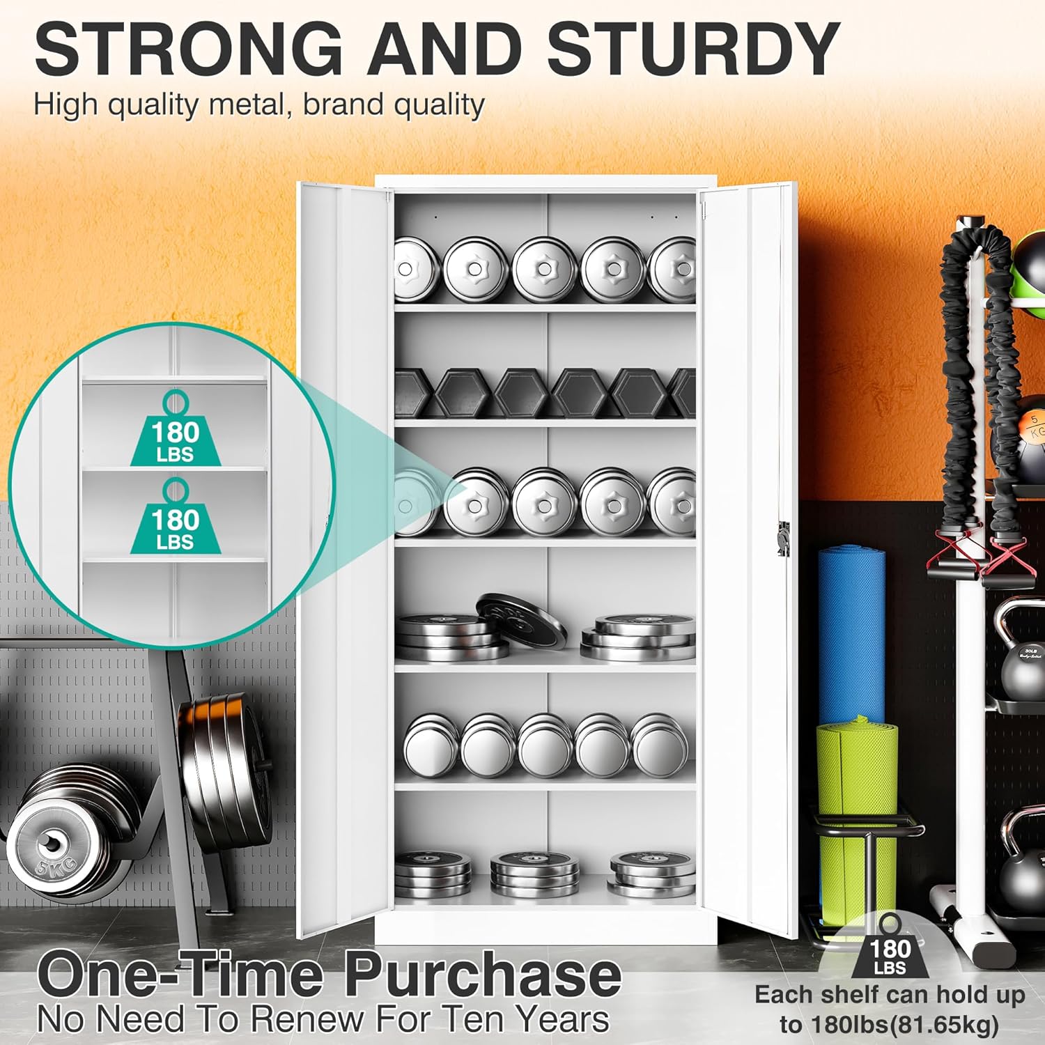 White Metal Storage Cabinet with 5 Adjustable Shelves,71" Tall Metal Cabinet with Locking Doors,Steel Cabinet with Lock,Lockable Storage Cabinets for Home,Office,Kitchen,Laundry,Pantry