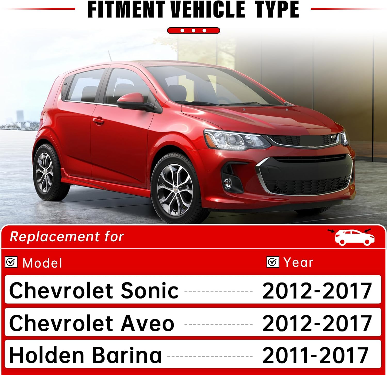 - Vehicle Service Type : 2011-2017 Holden Barina, 2012-2017 Chevrolet Aveo, 2012-2017 Chevrolet Sonic