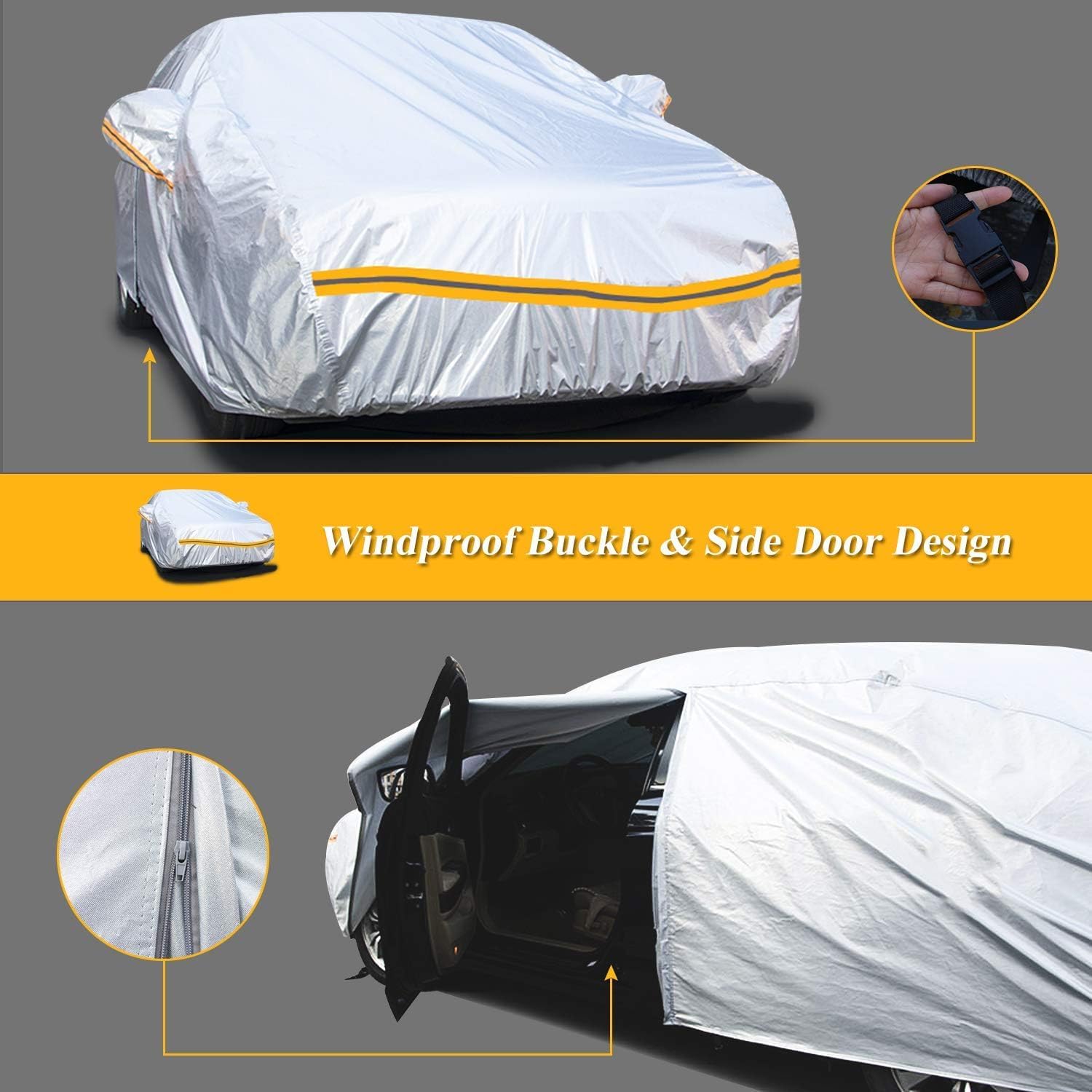 - 🚗【Unique Design】Car covers for automobiles all weather waterproof.1.Zipper on the driver's side:Convenient to get out things;2:Long fluorescent Light Strips:Protect your car at night;3. Large Mirror Pocket:Fashion appearance.4.A generous storage bag allows easy-stuff storage.