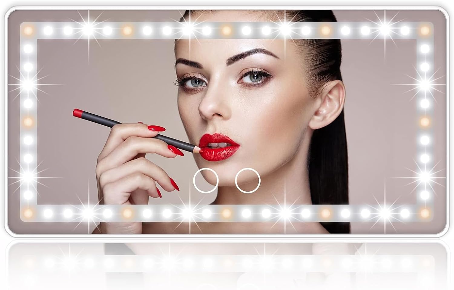 - SMART DOUBLE TOUCH CONTROL DESIGN - There are two touch sensors, simply touch one of touch switches to turn on and off. You can switch the two colors of the lights(cool white, warm yellow). Long press to adjust the brightness of the lights. Memory function makes this mirror with lights return to the same brightness and color when you last using.