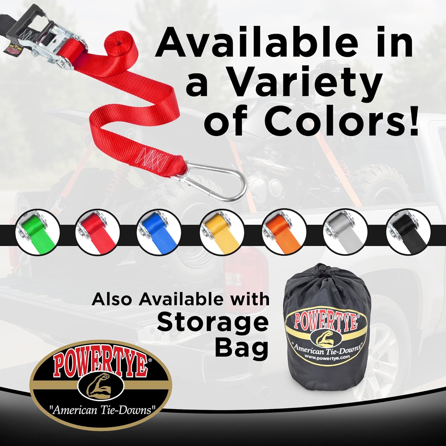 PowerTye - Made in USA - Heavy Duty Ratchet Tie Down Straps with Carabiner Hooks & Sewn-in Soft-Tye, for Motorcycle, ATV, Trailer & Cargo, 1,000 lb WLL, 1.5 inch x 6.5ft Long, Silver/Black (Pair)