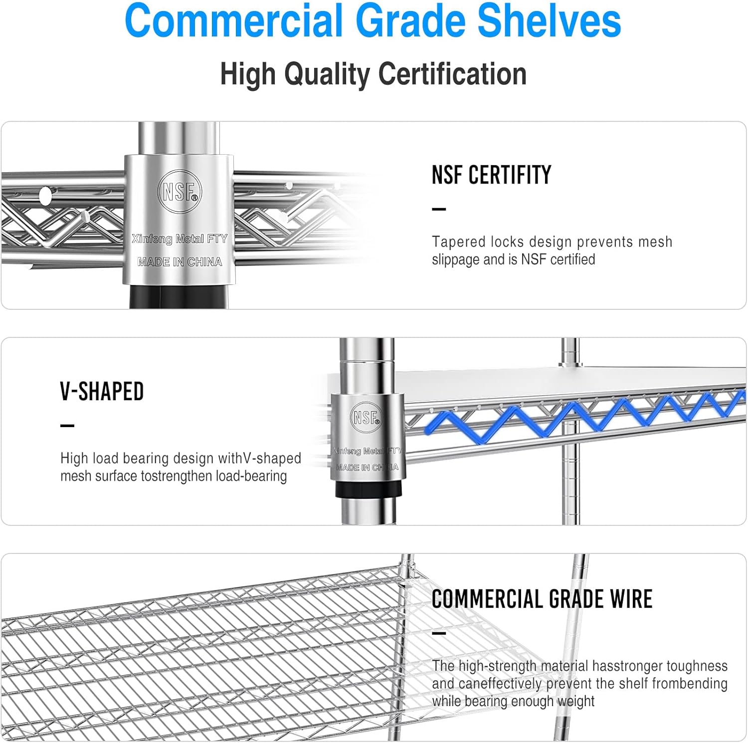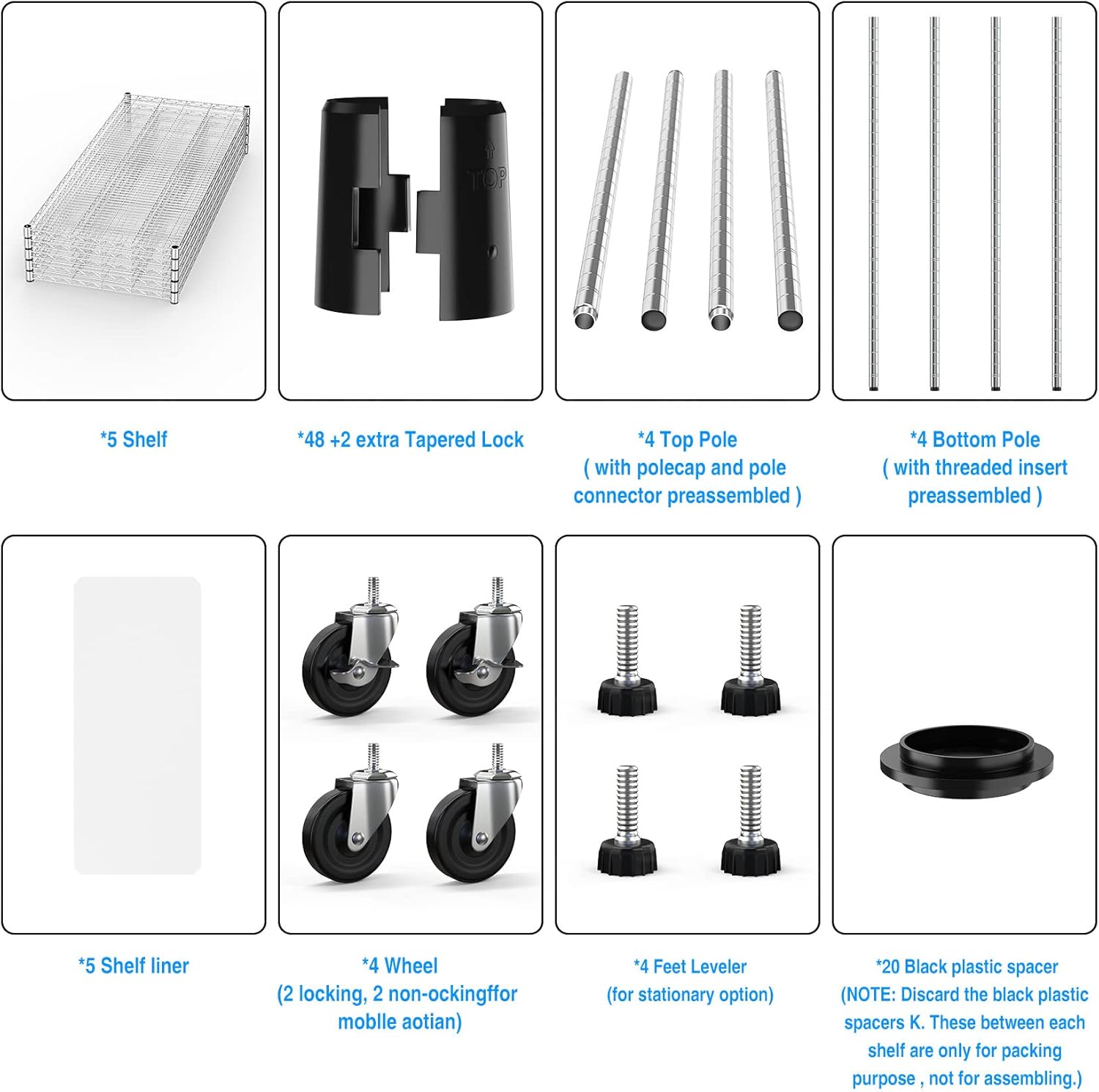 - STURDY & EXTREMELY DURABLE - Wire shelving made of heavy steel, it has excellent rust resistance and oxidation resistance. Our wire shelf liner is crafted to provide unparalleled quality, longevity, function and beauty. Better quality thicker than the competition. The 5 tier shelf unit passed NSF certified, safe and reliable. Storage rack are perfect addition to home, office, garage.