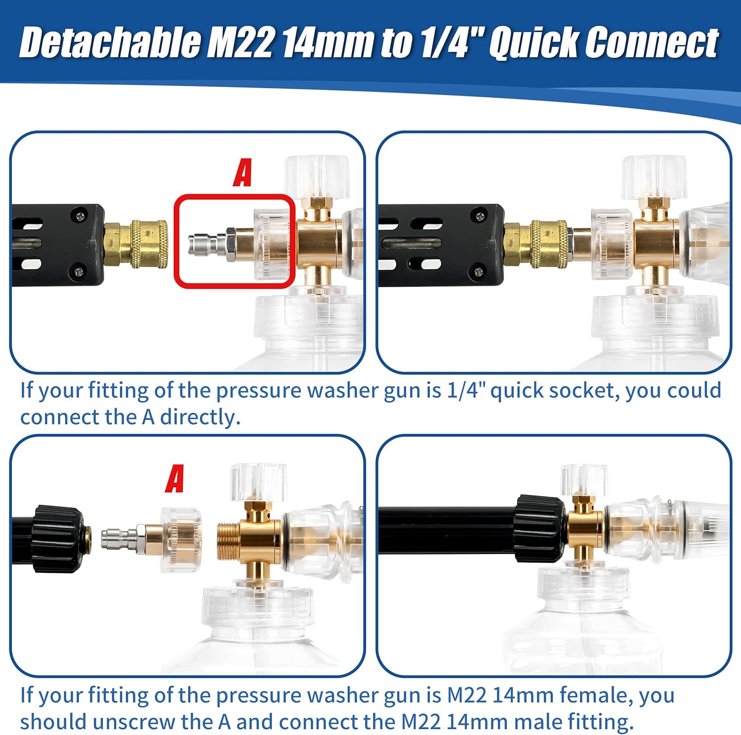 - MULTI-PURPOSE CONNECTION: Multi-purpose connections fulfill different needs in your life. Snow foam canon has a detachable 1/4 Inch Quick Connector. If your fitting of the power washer gun is M22 14mm female, you should unscrew the 1/4 Inch Quick Connector of the pressure washer foam cannon and connect the M22 14mm male fitting. If your fitting of the pressure washer gun is a 1/4” quick socket, you could connect the 1/4 Inch Quick Connector of the foam blaster directly.