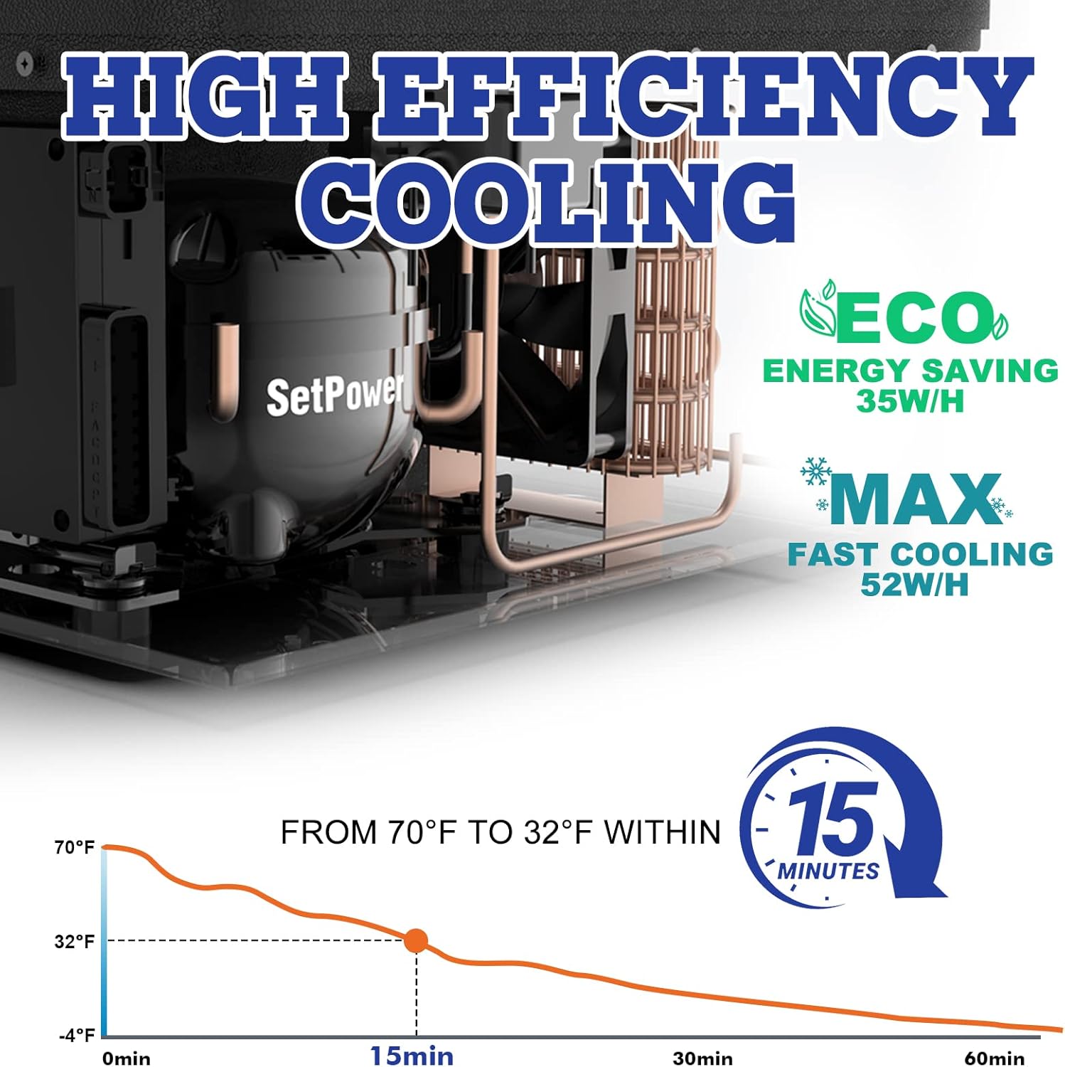 - 35W Low Power Consumption: MAX and ECO cooling modes are optional in the Setpower portable refrigerator, consuming less than 35W/H in ECO mode and less than 52W/H in MAX mode.With Setpower powerful compressor, this car refrigerator can quickly cool from 70°F to 32°F in 15 minutes; it takes about 45 minutes to reach a minimum temperature of 0°F. Designed with a metal-plastic hybrid build for secure magnetic attachment with SetPower batteries