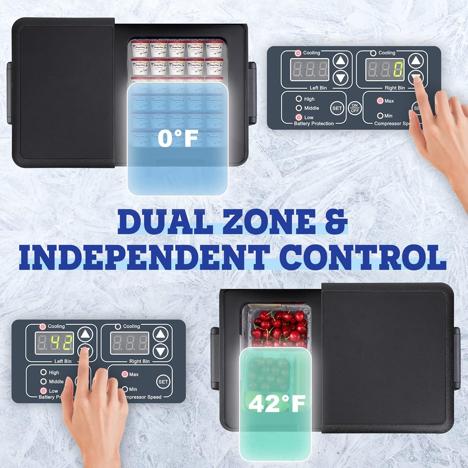 - Dual Zone And Dual Temperature Control Electric Cooler: Setpower 12 Volt Refrigerator is equipped with a "true dual zone design" to avoid flavor transfer and mutual contamination of food between the two zones.And,this portable freezer can be independently controlled from 50°F to 0°F via the LCD panel.You can get a refrigerator and a freezer at the same time