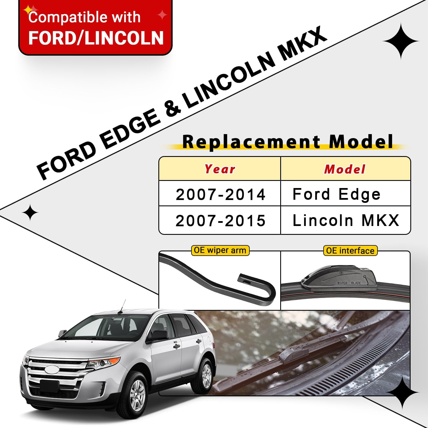- {FITMENT1}: Replacement for 2007 2008 2009 2010 2011 2012 2013 2014 Ford Edge 26inch + 20inch front with 14inch rear windshield wiper blades.