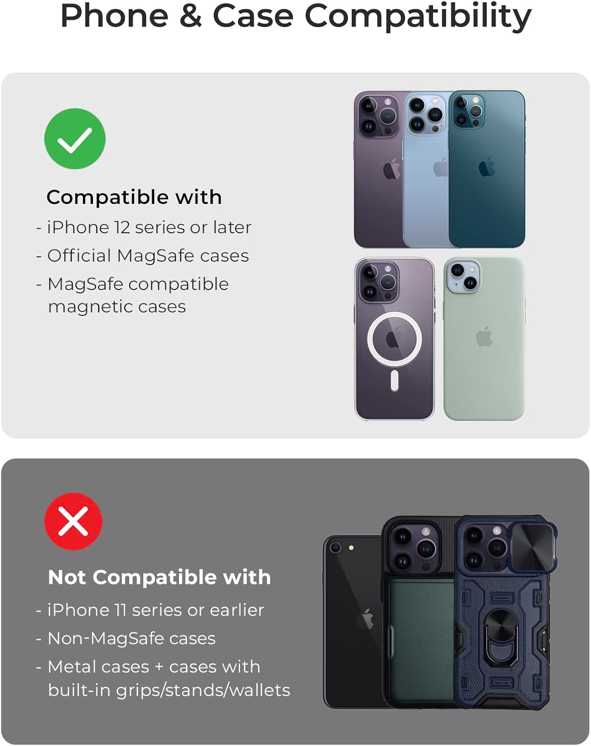 - Designed ONLY for MagSafe series iPhones, including iPhone 12 series, iPhone 13 series, iPhone 14 Series, and iPhone 15 series, and MagSafe compatible cases.