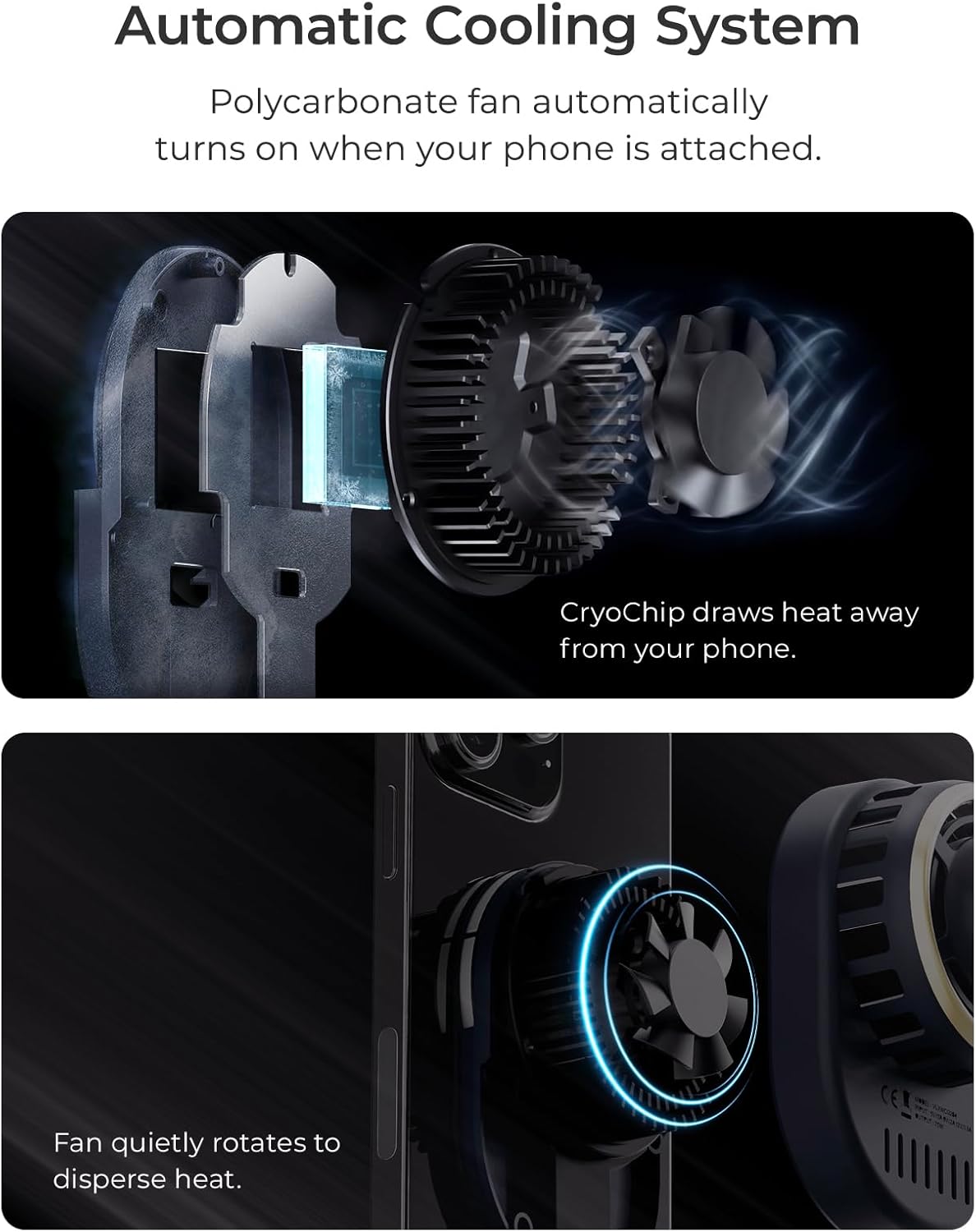 - Advanced Cooling Technology: Our CryoFlow cooling technology detects when your iPhone is connected and automatically turns on to draw heat away from your phone for a faster charge. The cooling system features a semiconductor CryoChip, aluminum heat sink, and polycarbonate fan.