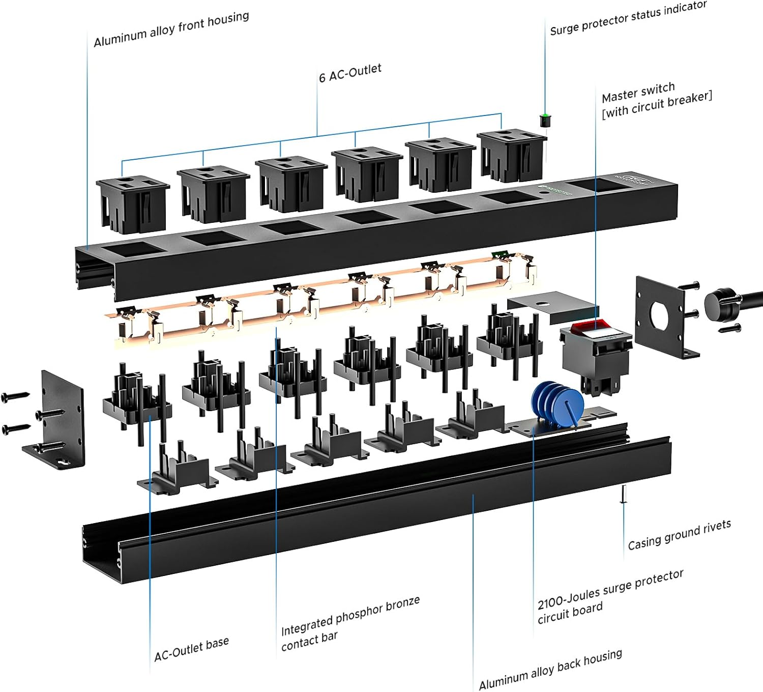 - [Metal Heavy Duty] Heavy duty power strip with 1.5mm extra-thick aluminum alloy housing and reinforced engineering plastic covers make it extremely strong and durable. The 6 outlet power strip is equipped with a sturdy 6ft cord, allowing convenient placement of the metal power strip in locations far from the power source without worrying about the cable being too short. And 15AMP/14AWG SJT grade wire supports up to 125V/1875W of power.