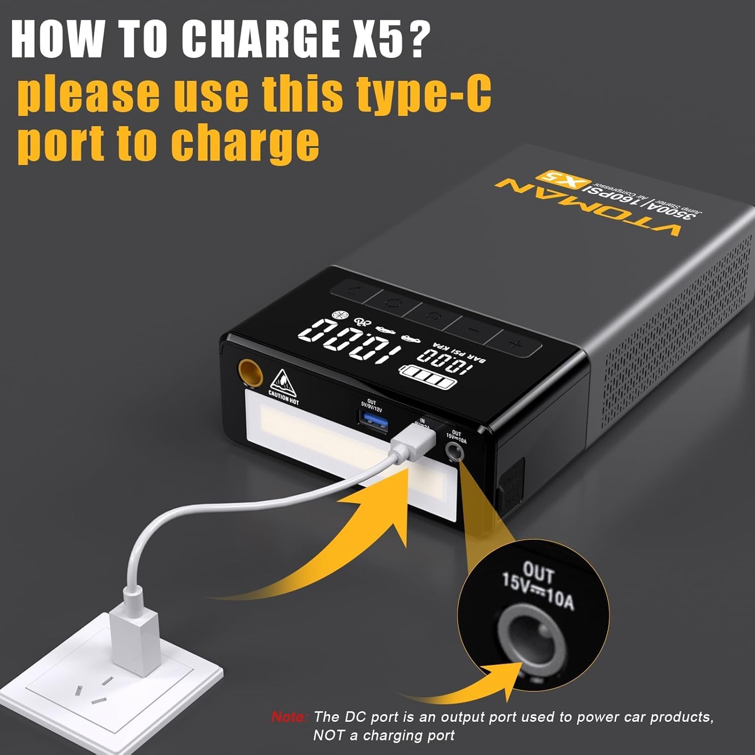 - All-in-one jumper starter - Say goodbye to old bulky battery jump boxes! The VTOMAN X5 is not just a powerful jump starter and tire inflator, but also a compact power bank battery pack. 24 months standby time make it to be your all-in-one solution for emergencies on the road. Moreover, the X5 features a 400-lumen LED light with 3 lighting modes (normal, strobe, sos). Plus it supports 18W Type-c fast charging, just 10 minutes to charge to fully inflate a tire!