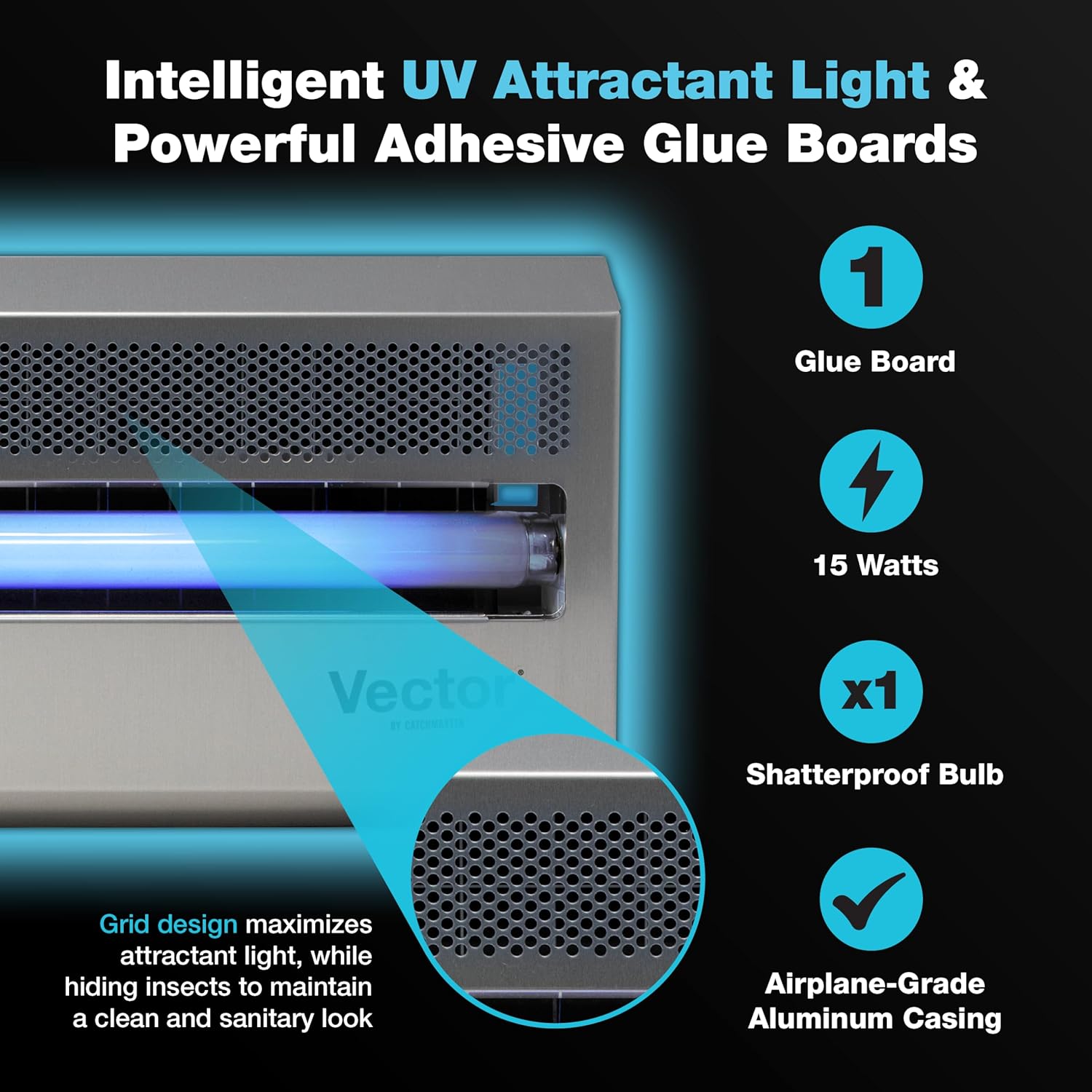 - INDUSTRIAL STRENGTH UV TRAP: Catchmaster's Insect Vector 30 Light Trap is remarkably discreet and undemanding to maintain. It's made with airplane-grade aluminum casing and an industrial-strength design for increased durability. This ultra-sturdy indoor fly trap for home comes with a replaceable glue board and 2 shatterproof 15-Watt bulbs (Philips TL-D 15W Actinic BL)