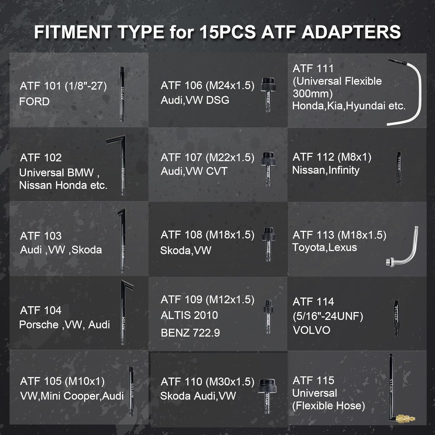 - 15PCS ATF Adapters: Fluid pump kit contains 15 transmission fluid adapters, which metal part is made of hardened steel with black electrophoretic surface treatment for rust and corrosion protection. Adapters are labeled with NO. for finding the suitable model quickly from manual. A variety of adapters allow the ATF refill kit to fit various models such as Ford, BMW, Nissan, Honda, Audi, VW DSG, VW CVT, Skoda, Porsche, Benz, Mini Cooper, Kia, Toyota, Hyundai, Infiniti, VOLVO, Lexus
