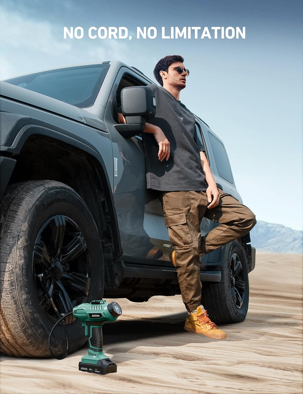 AstroAI C2 Cordless Tire Inflator Air Compressor 20V Rechargeable Battery Powered 160PSI Portable Air Pump with 12V Car Power Adapter Digital Pressure Gauge for Cars Motorcycles JY16P160-18 Green