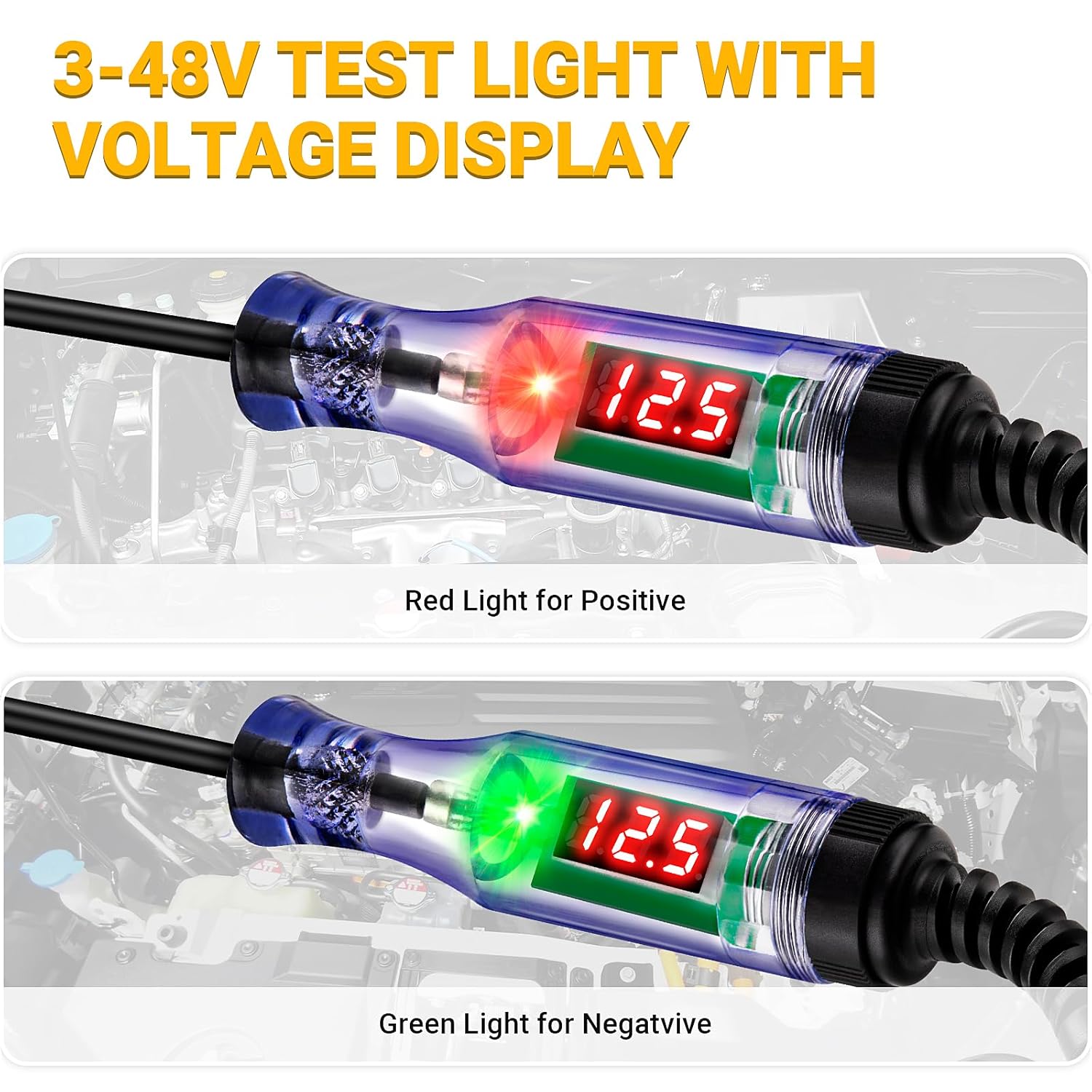 - 【Detectable Positive & Negative】: Car test light panel has a dual color red & green light to detect the positive & negative poles of the circuit. Attaching the large size alligator clip either to negative or positive ground, while using the long probe to touch another side. Then signal lights will indicate the polarity: Red for positive indicating the reading / Green for negative without the readouts.
