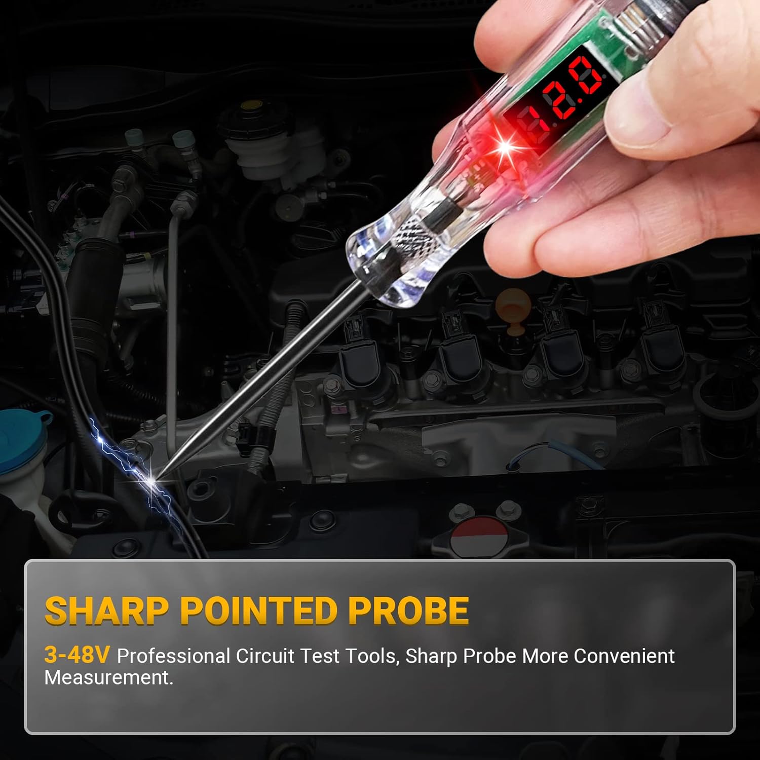 - 【Wide Rage of Use】: This automotive voltage tester with 3-48V DC voltage testing range, used to detect power, ground and find shorts & damages in wires. Quickly check automotive headlights, taillights, turn signal circuits, faulty sockets, fuse connections and more, will save your time and speed up the job, perfect for automotive use.