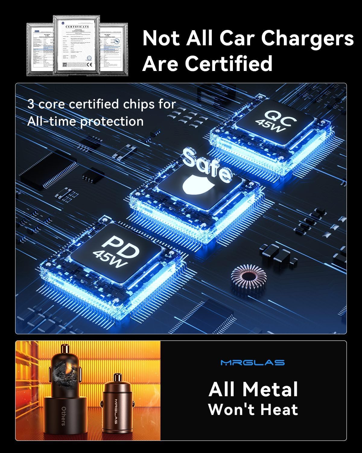 - ALL ZINC ALLOY METAL PROTECTION: A all metal well-built body brings a very sleek sturdy feel compared with the usual plastic. Metal Material Provides better heat dissipation, scratch resistance, attractive design. With multiple safety certifications and a built-in smart IC, MRGLAS usb c car charger fast charge can prevent overcurrent, short circuit, over-voltage, under-voltage, over-temperature, and overpower to protect your device.