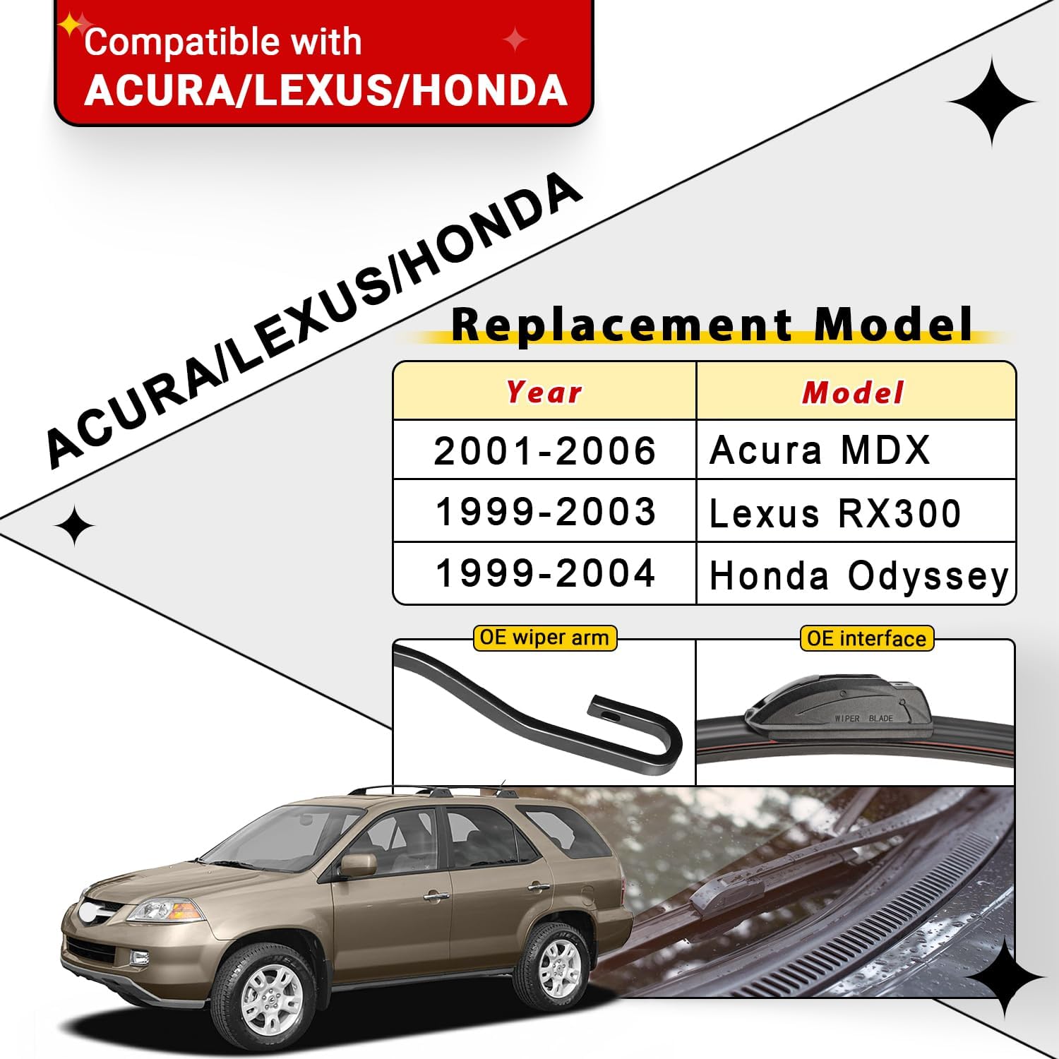 - {FITMENT2}: Replacement for Honda Odyssey 1999 2000 2001 2002 2003 2004 24inch + 21inch front with 16inch rear windshield wiper blades.