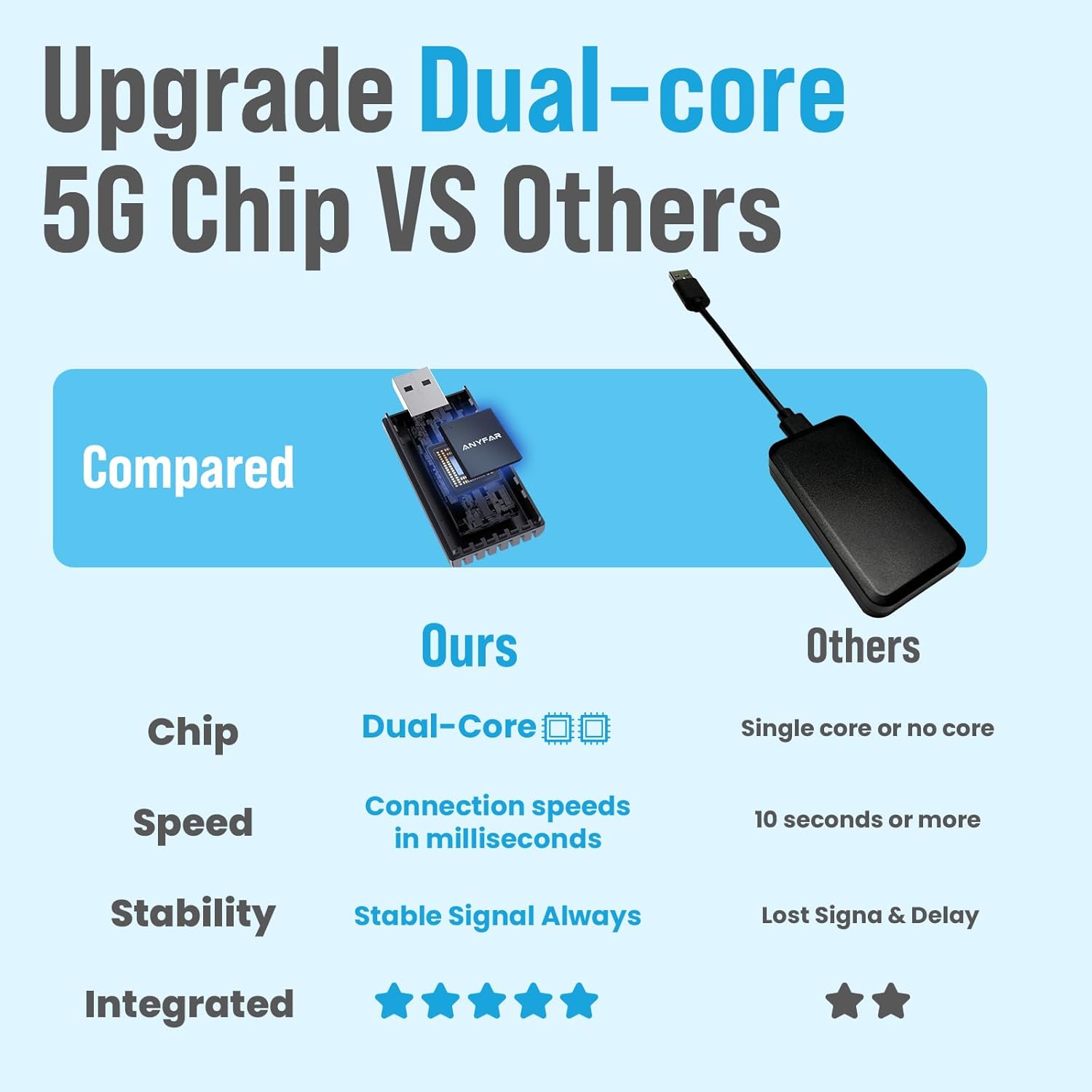 - ✅ 【5G Dual-core Chip, No lag】 With the dual-core 5G chip support, the connection stability is higher, and the connection speed is up to a few seconds. The high-speed 5.8GHz signal transmission technology also keeps you away from the trouble of freezing.