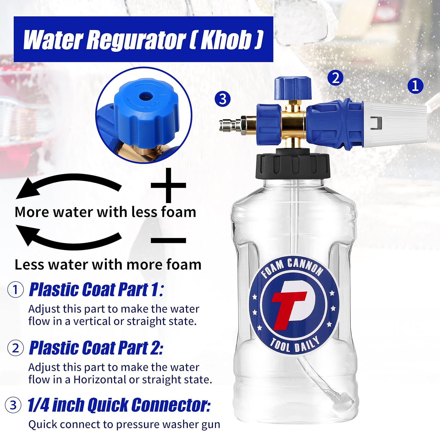 - EASY TO INSTALL: First, fill the foam bottle with soap and warm water to create thick foam. Then, attach the cannon to your power washer gun or wand. Finally, adjust the knob on top to control the foam level and the nozzle to adjust the spray pattern. The knob allows you to adjust the amount of foam dispensed, while the nozzle controls the pattern of the spray. With our foam cannon, you can easily achieve thick foam for effective cleaning.
