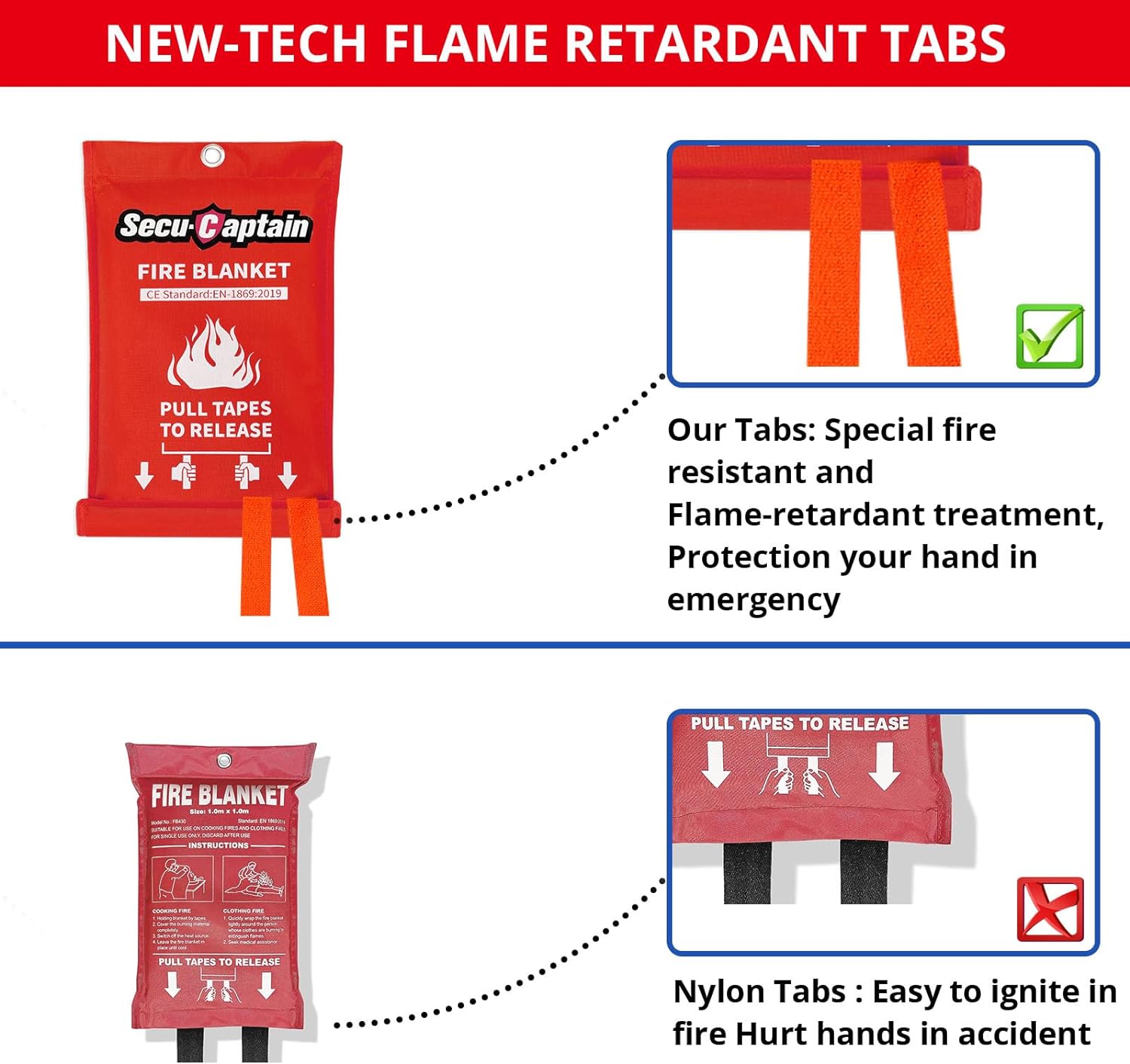 - NEW-TECH FIRE RETARDANT TABS : This design fire blanket tabs with special high temperature fireproof and flame retardant treatment.Compared with the nylon tabs which will burn hands under heat source, our fire retardant tabs are not affected by high temperature, and can be pulled out in ease without hurting hands. Safe to use
