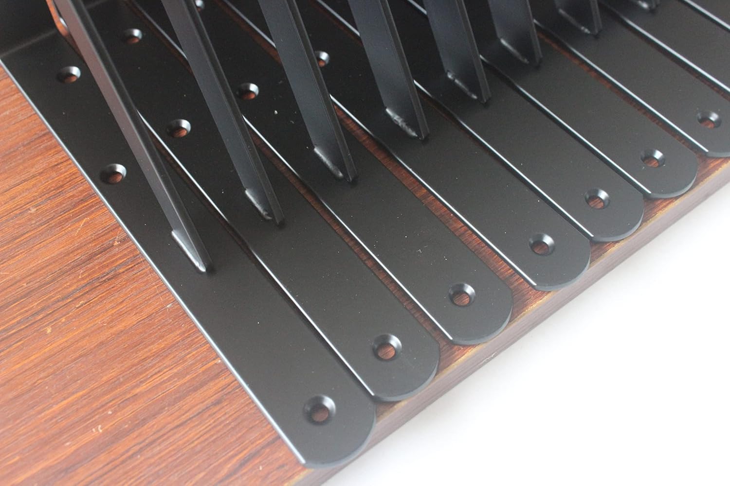 - Size:L 10" x H 8" x W 1", 3mm Thick. Package included: 4 x Brackets , 12 x long Screws, 16 x short Screws (Wood plank is Not included)Our floating shelf brackets come with 4 brackets for your wall mounted shelves. Our heavy-duty brackets can support Audio Equipment,bookshelf,kitchen ware,electric power tools , TV bench ,farm tools,etc